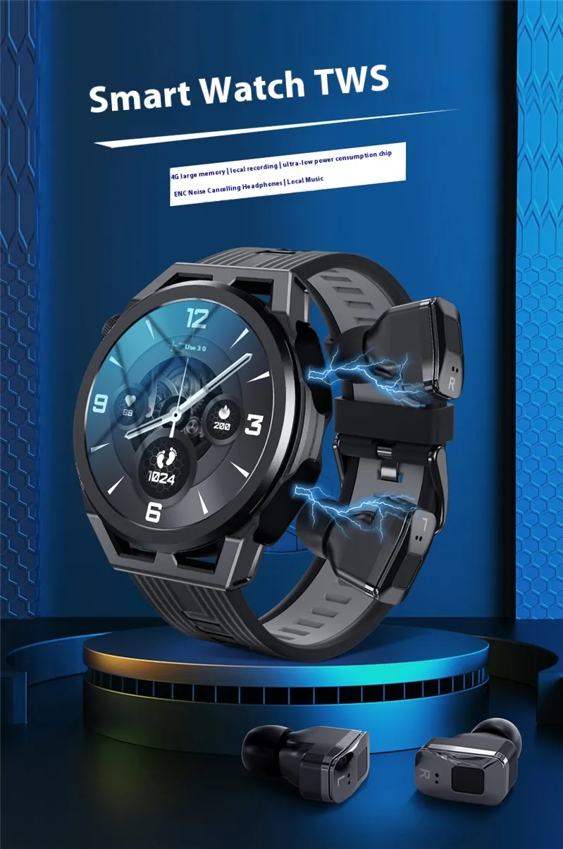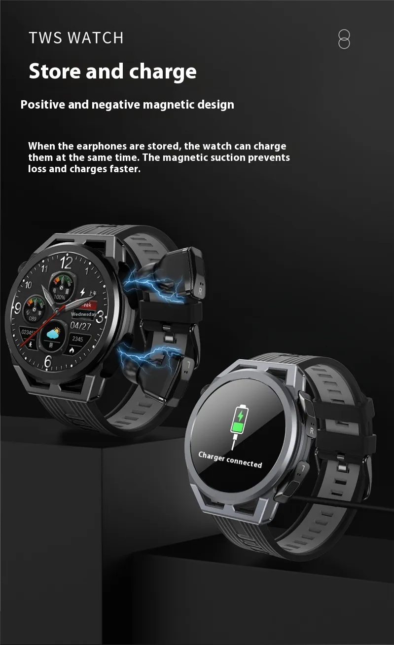 - All-in-One Device: Combines smartwatch and TWS earbuds in one sleek package.