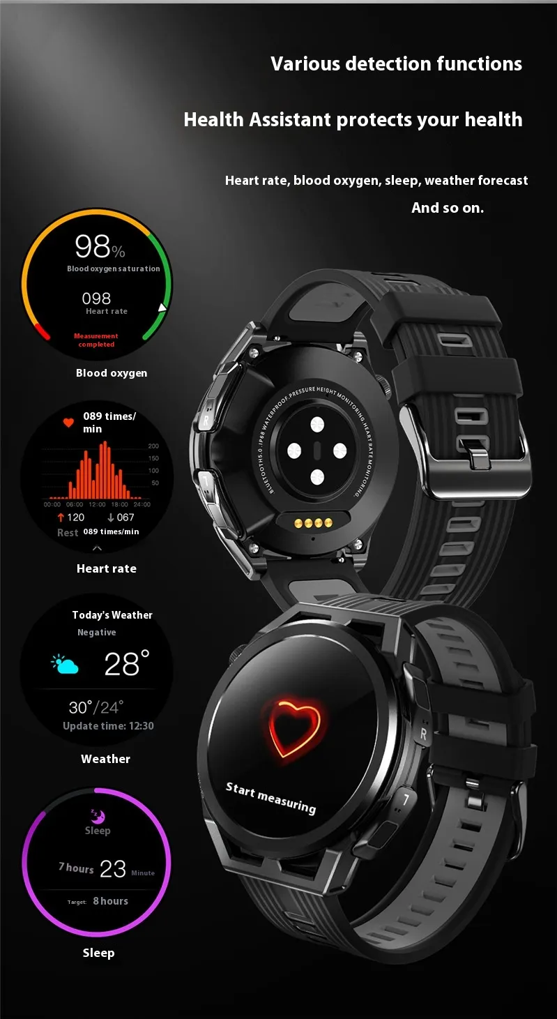 Functions: step counting, heart rate monitoring, blood pressure measurement, Bluetooth call, smart reminder, remote control selfie, sleep