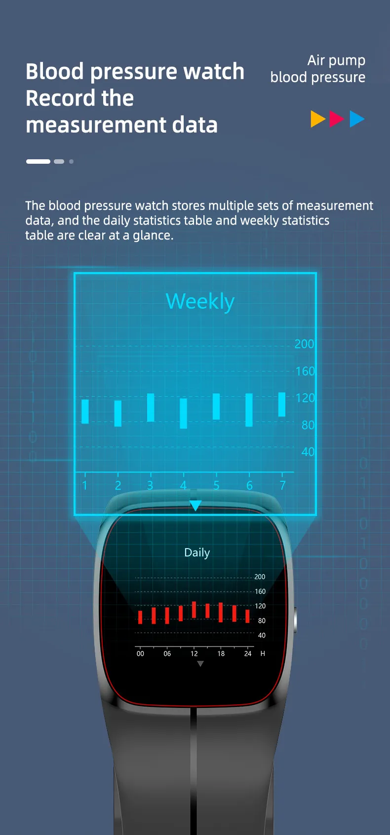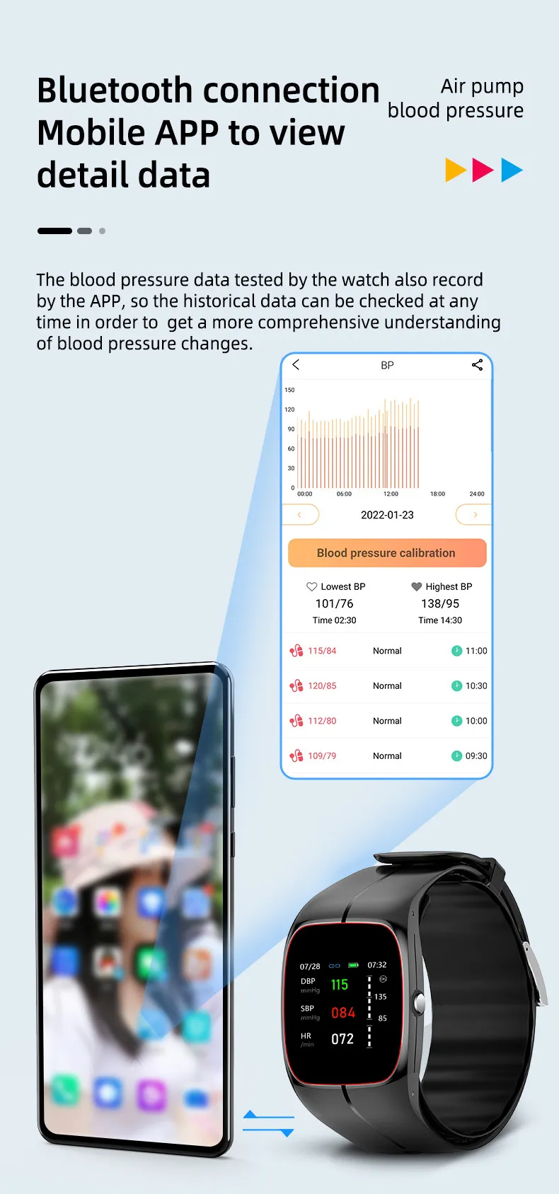 Functions: step counting, heart rate monitoring, blood pressure measurement, smart reminder, remote control selfie, sleep monitoring, blood