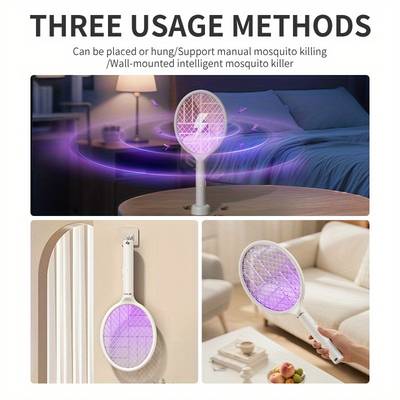 This electric fly swatter integrates a purple trap lamp, a 5-layer safety mesh, and an electric racket, offering a comprehensive solution