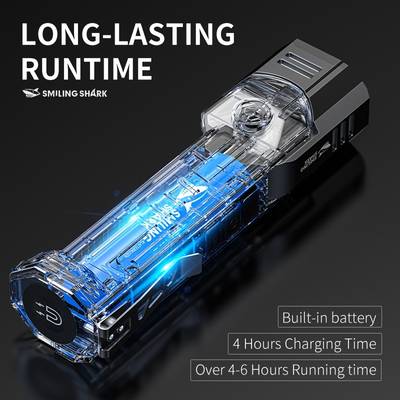 The SMILING SHARK GZ5106 flashlight is powered by a 1500mAh lithium-ion rechargeable battery, providing long-lasting use. It also includes a