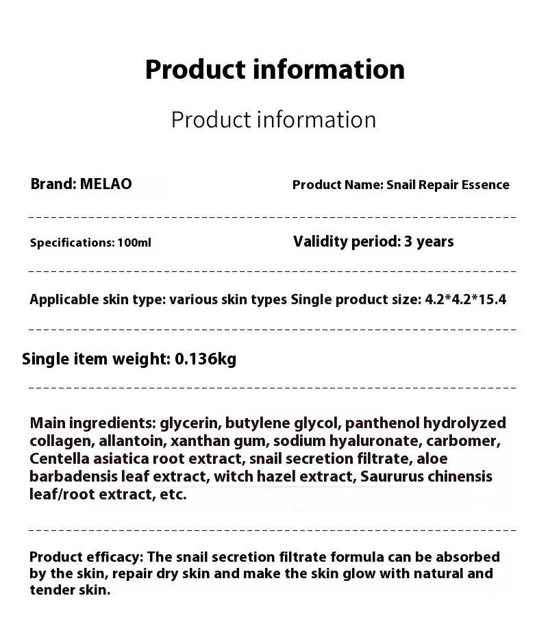Our Snail Skin Care Facial Care Solution harnesses the power of snail mucin to provide an innovative approach to skincare. Known for its regenerative properties, this solution hydrates, nourishes, and rejuvenates the skin, making it an essential part of your daily routine.