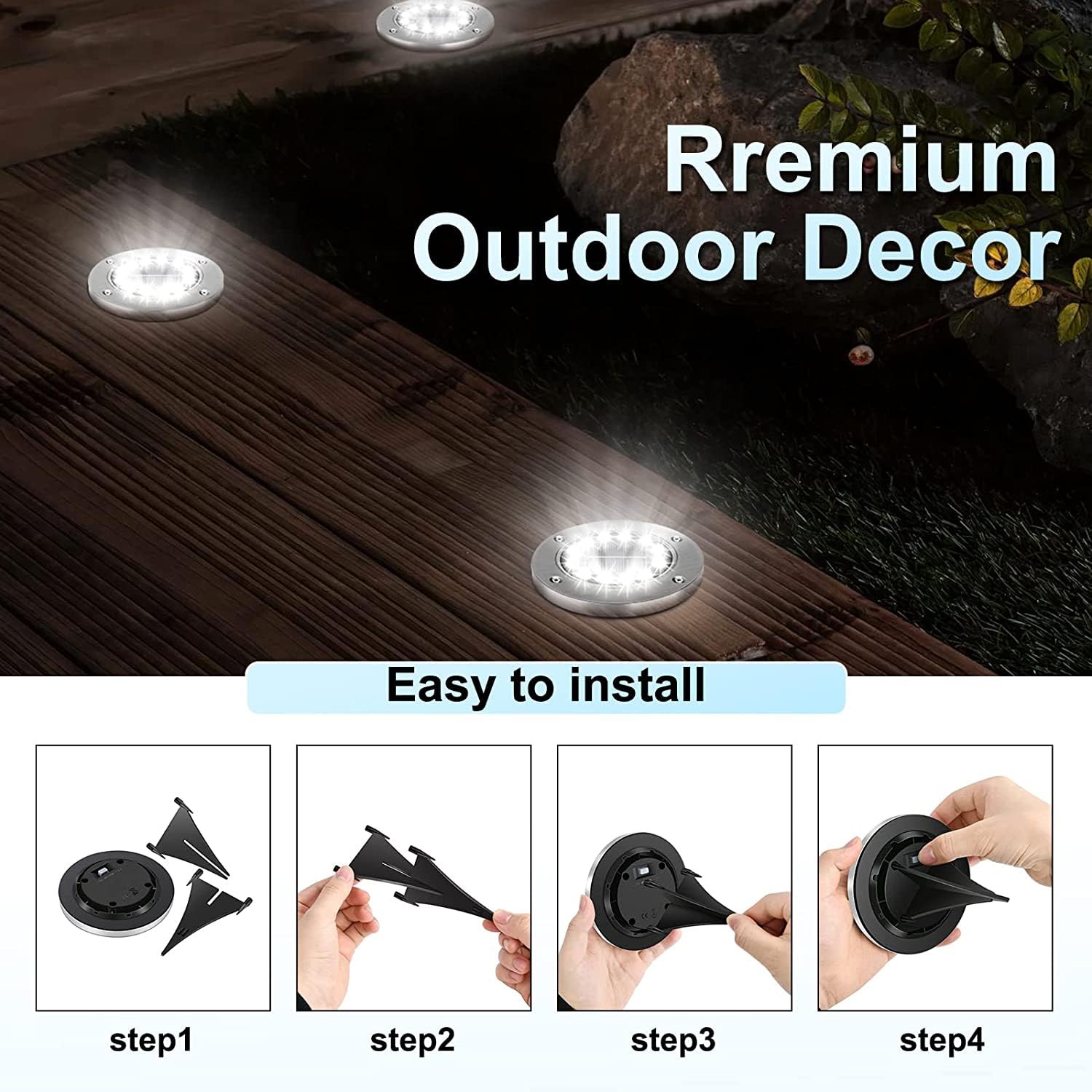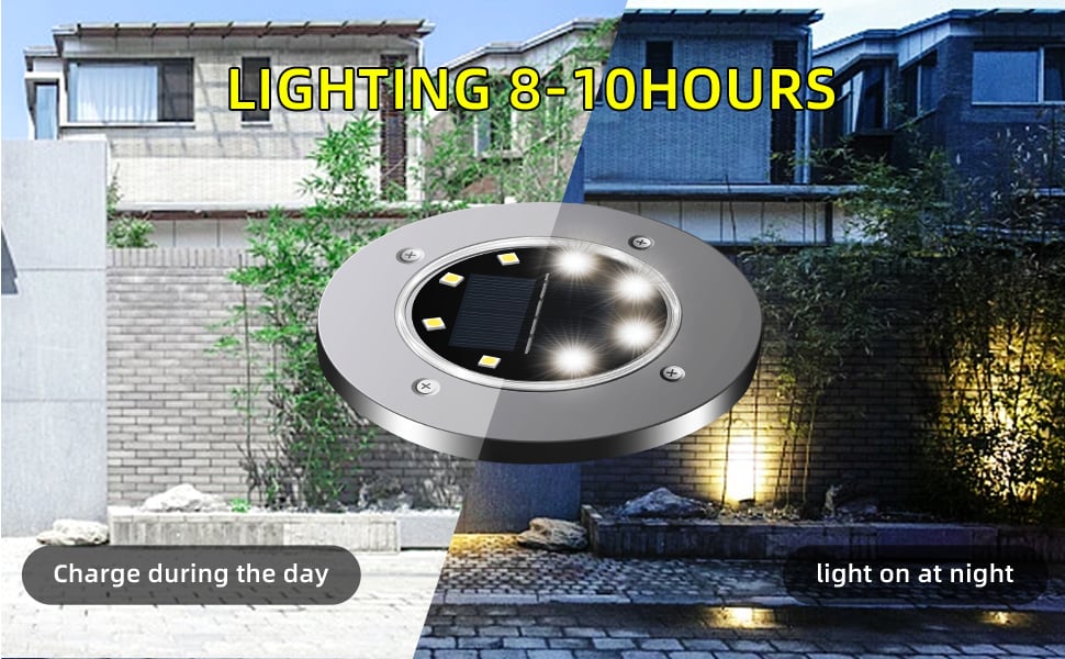 - đź’ˇSolar Garden In-ground Lights:Â Each solar ground lights has 8 LEDs with a built-in 600 mAh NIMH rechargeable battery, lights will work up to 8-10 hours after fully charged, energy saving and eco-friendly.