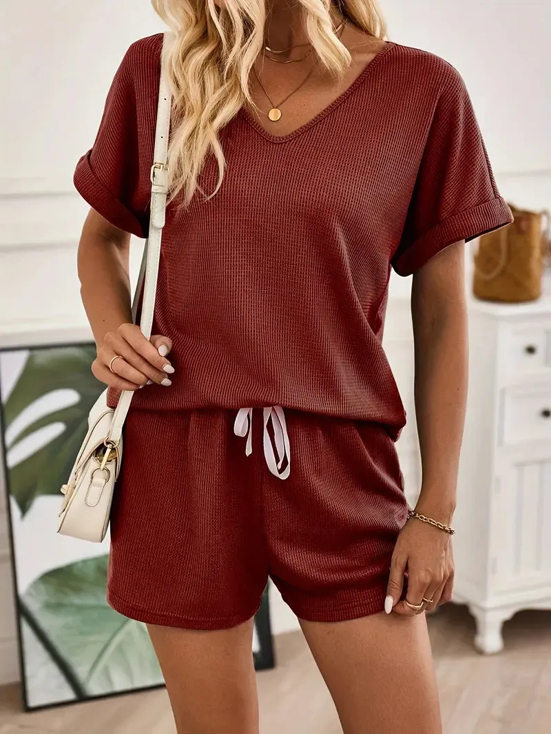 Step out with confidence in the Solid Color Elegant Two-Piece V-neck Turned Cuff Casual Lace-Up Shorts Suit, a perfect blend of casual comfort and modern sophistication. This set includes a flattering V-neck top and matching lace-up shorts, designed with turned cuffs for a polished finish.