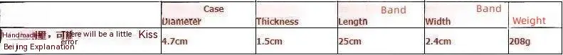 Size: dial diameter 4.7cm, thickness 1.5cm, strap length 25cm, strap width 2.4cm