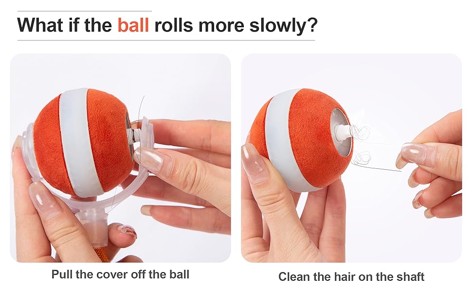 ã€Can Play On Any Floor】The powerful motor enables the interactive cat ball toy to move quickly on thick carpets, thin carpets, and hard floors. However, the movement speed on carpets is slightly slower than that on hard floors. If you notice a significant slowdown in running speed compared to before, follow the instructions to clean the hair on the connecting rod
