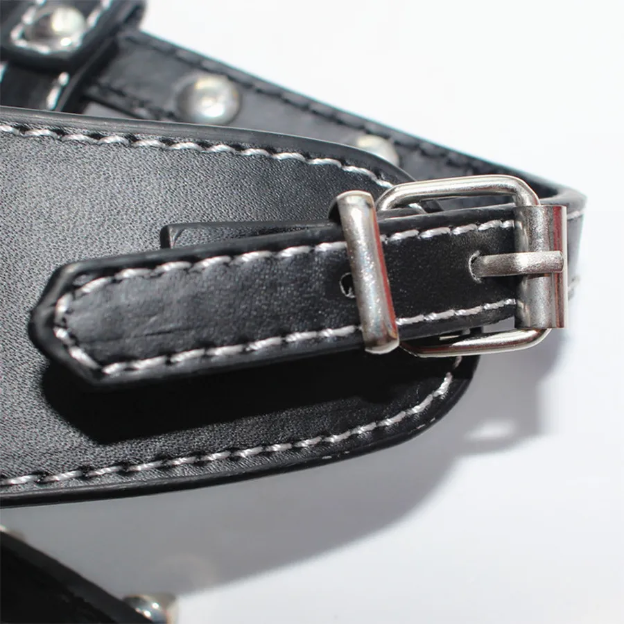 Constructed with heavy-duty nylon webbing, industrial-grade stitching, and abrasion-resistant materials, the harness is built to withstand repeated use in rugged conditions. Metal hardware—such as D-rings and tri-glides—is fully plated for corrosion resistance, ensuring longevity in coastal climates like those around Wellington or Tauranga. The spiked detailing adds bold style while also serving as a visual deterrent for encounters with other animals.