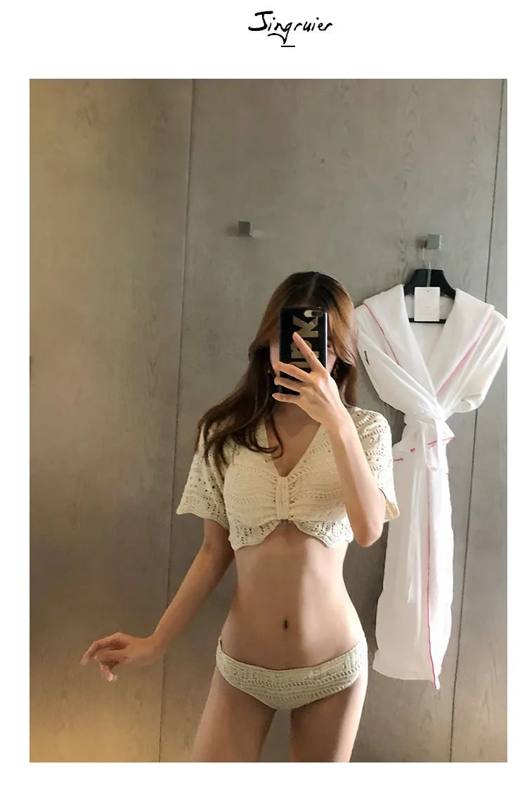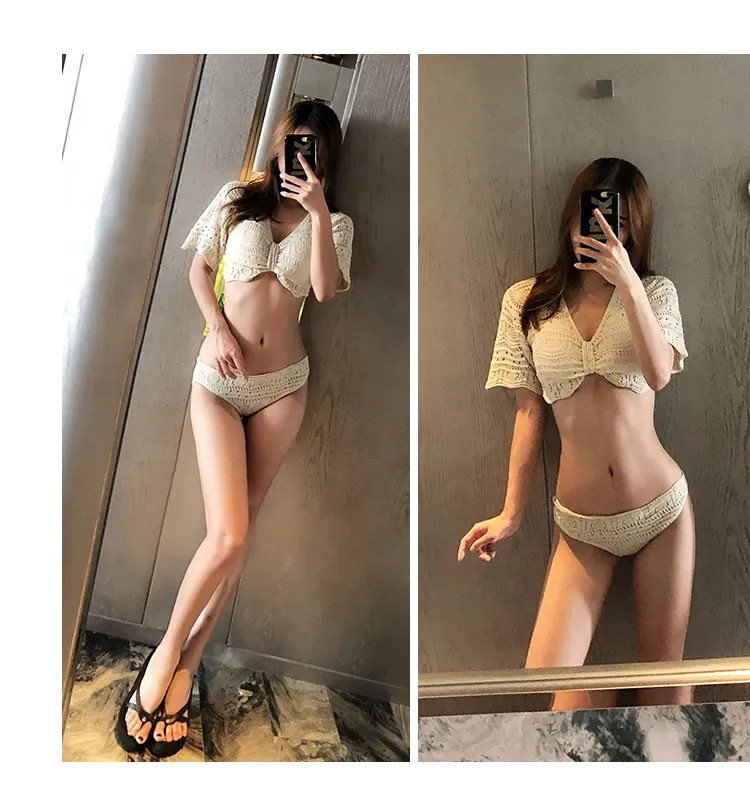 Why Choose the Split Half-Sleeved Bikini Knitted Beige Swimsuit?