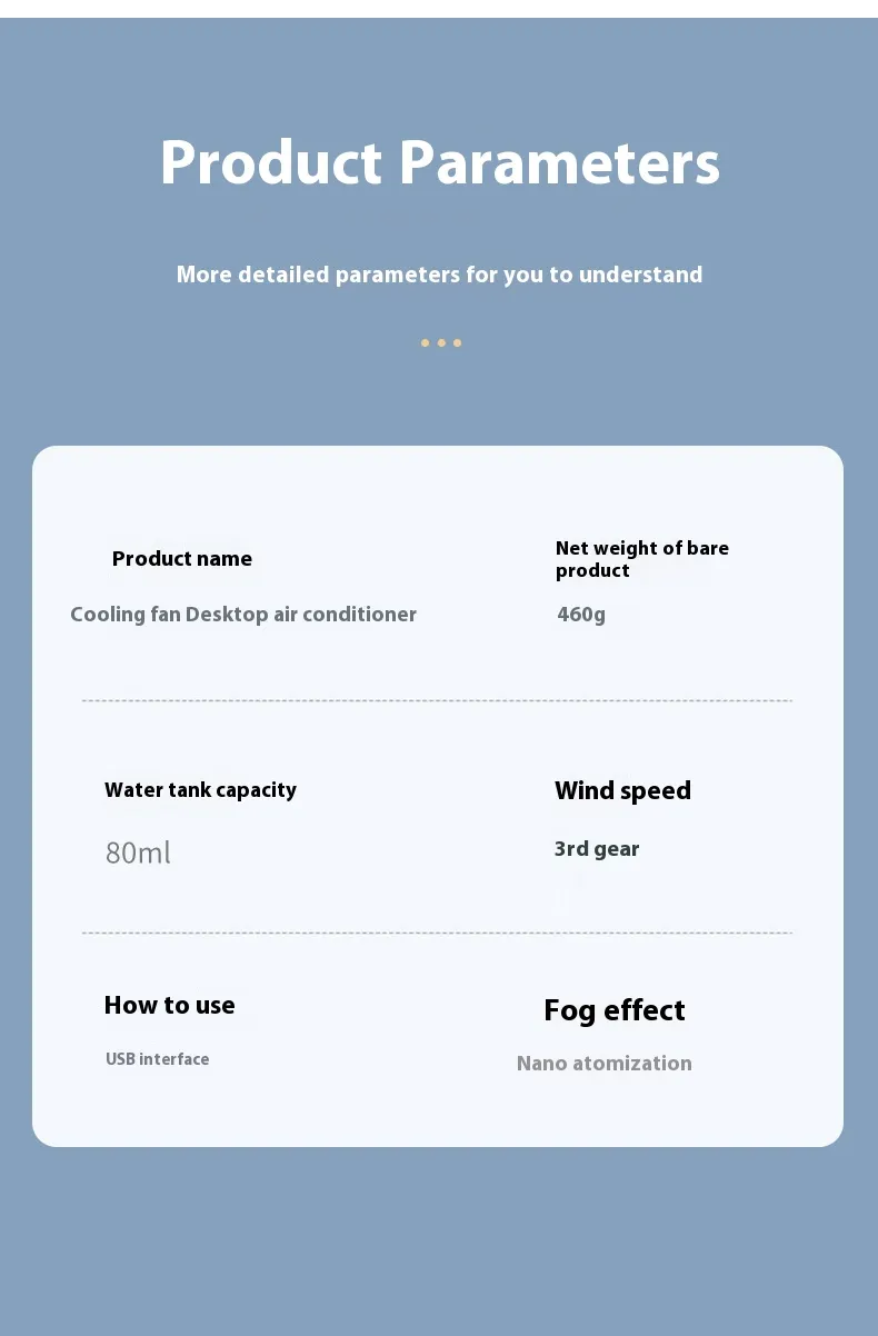 Unlike ordinary fans that just move warm air around, this mini air conditioner fan features a built-in spray function. Fill the water tank, turn on the mist mode and enjoy a gentle cooling effect as the fine spray mixes with the airflow. This can help reduce the feeling of dryness and make the air feel more comfortable on your skin, especially during hot afternoons or stuffy nights.