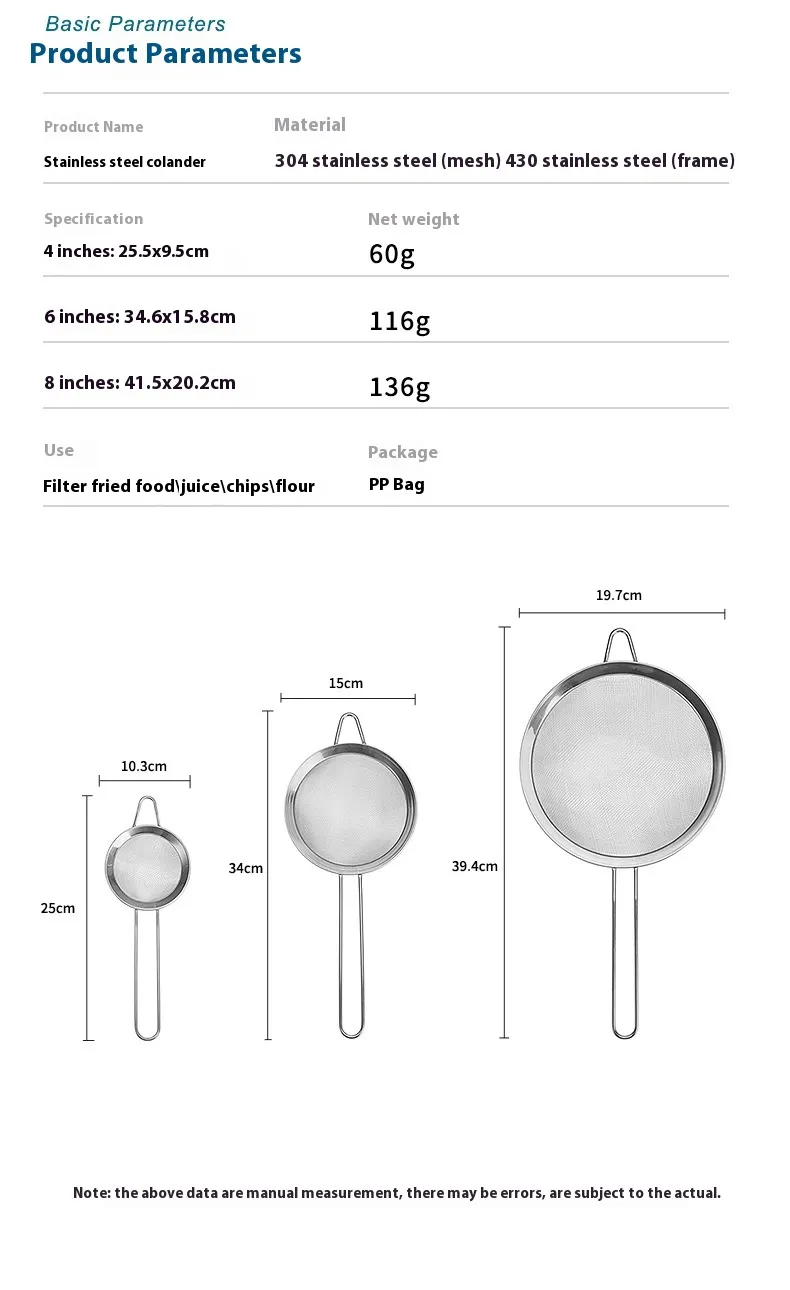 With its rust-resistant, non-corrosive material, this filter is built to withstand frequent use and maintain its performance over time. The fine mesh ensures that even the smallest particles are captured, making it ideal for tasks requiring precise filtration. The ergonomic handle ensures easy handling, while the compact design allows for easy storage when not in use.