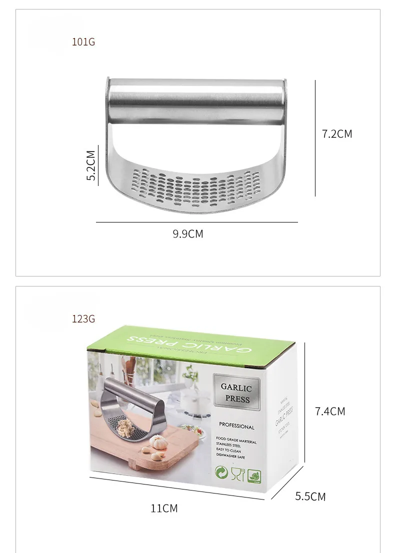 The garlic press is made from premium stainless steel, which offers excellent strength and resistance to rust and corrosion. This material ensures that the garlic press remains durable and functional for years, withstanding the pressure of crushing garlic cloves without bending or breaking.