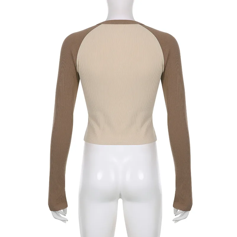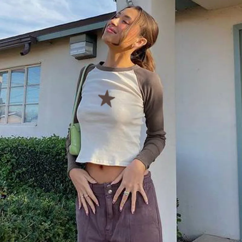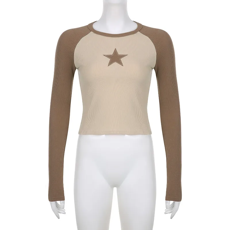 Stars Patchwork Long Sleeve T-shirts Women Slim Tops