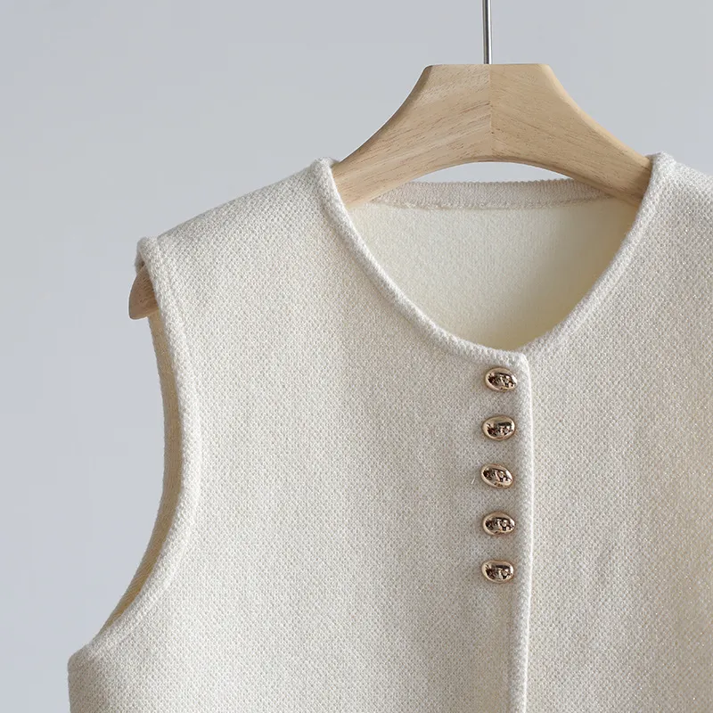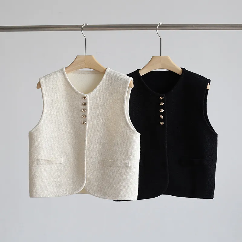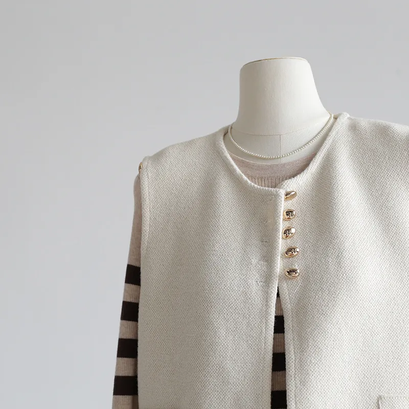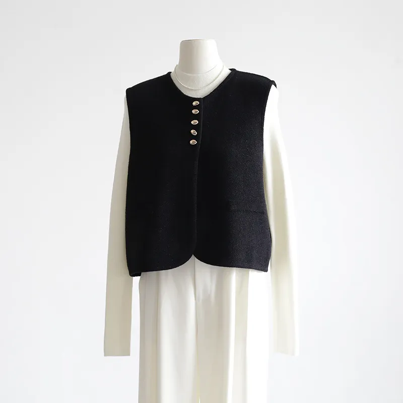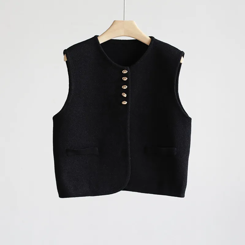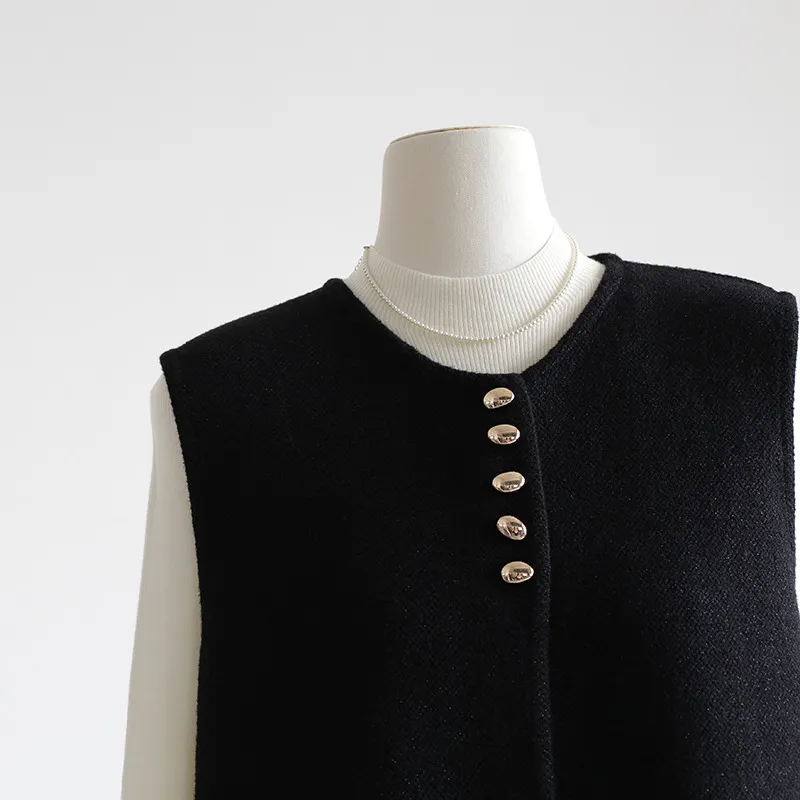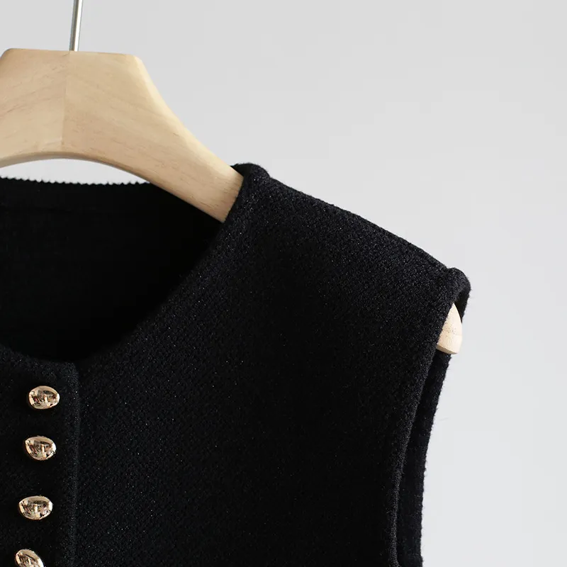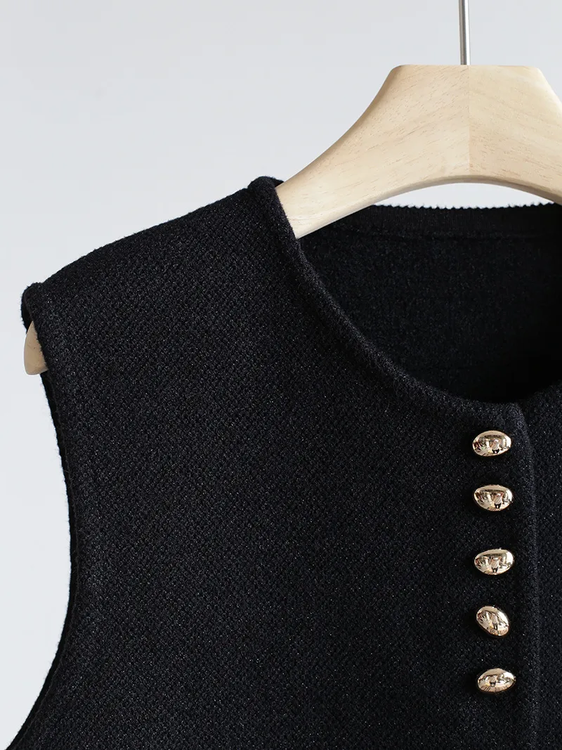 Static Luxury Old Money Style Round Neck Golden Bean Buckle Knitted Vest