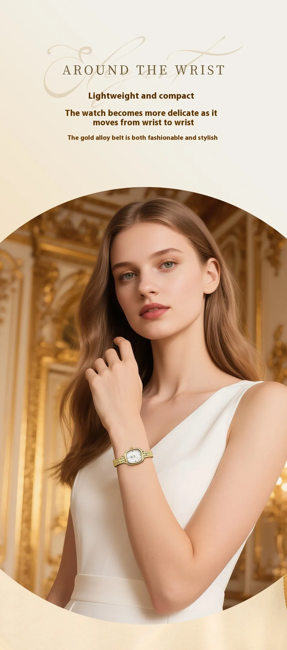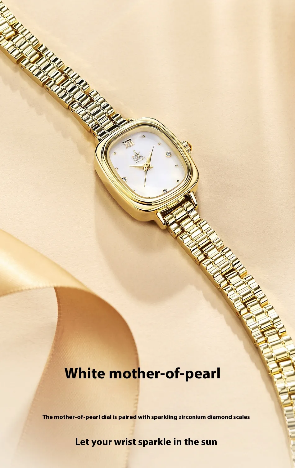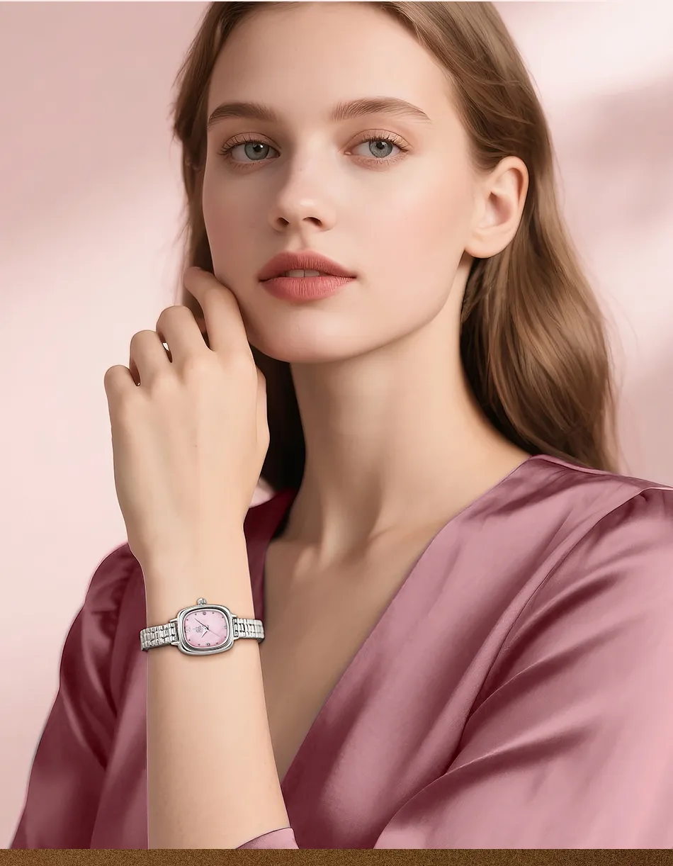 The small square dial is a key feature of this watch, offering a modern twist on traditional round watches. The sharp edges and clean lines of the square face give the watch a contemporary and sophisticated aesthetic, while the minimalist design ensures that it remains timeless and versatile. The compact size makes it perfect for those who prefer a subtle and chic accessory that adds elegance without overwhelming their wrist.