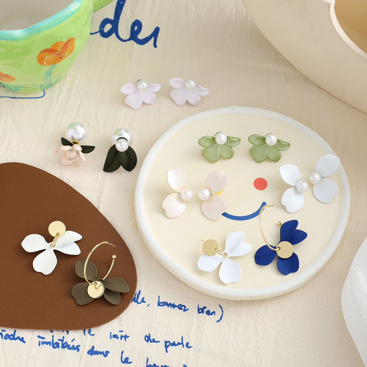 Color: two leaves White sterling silver stud earrings, two leaves beige sterling silver stud earrings, four leaves green sterling silver
