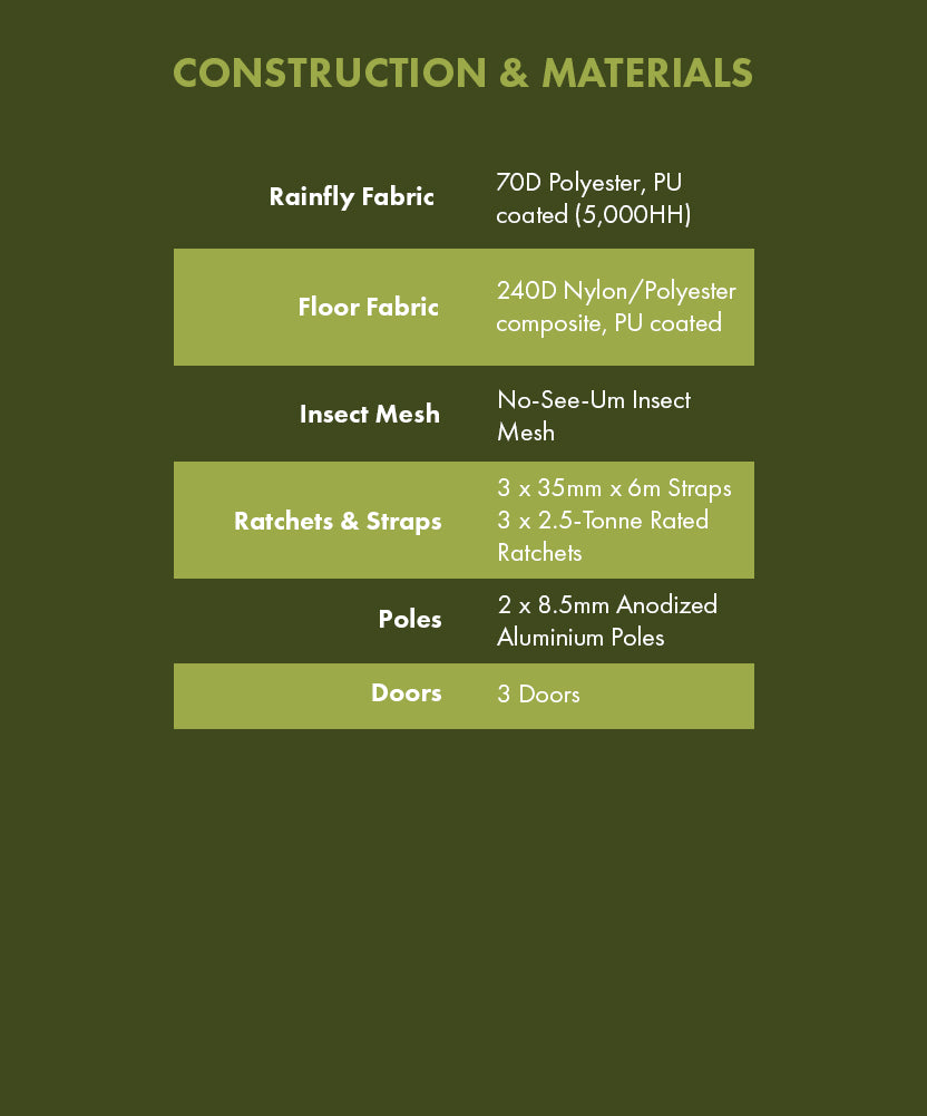 - 3 Entrance Doors, as well as a Central Floor Hatch, for easy access to all areas of the tent.