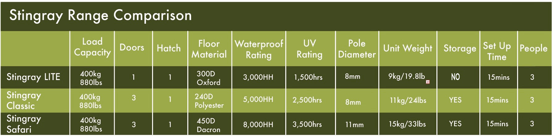 The Stingray's acclaimed design has been featured in the Museum of Modern Art in New York and won multiple international awards for its design, functionality and practicality. It can be set up over any type of terrain and offers increased separation from the cold wet ground and those pesky critters and other creepy crawlies!