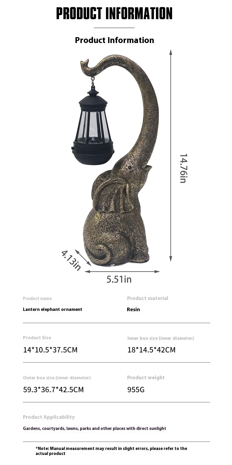 The Stone Elephant Resin Lantern Ornament is designed for versatility, making it an excellent choice for both indoor and outdoor environments. Its durable resin construction is weather-resistant, so it can withstand the elements if placed in your garden, on the balcony, or by the poolside.