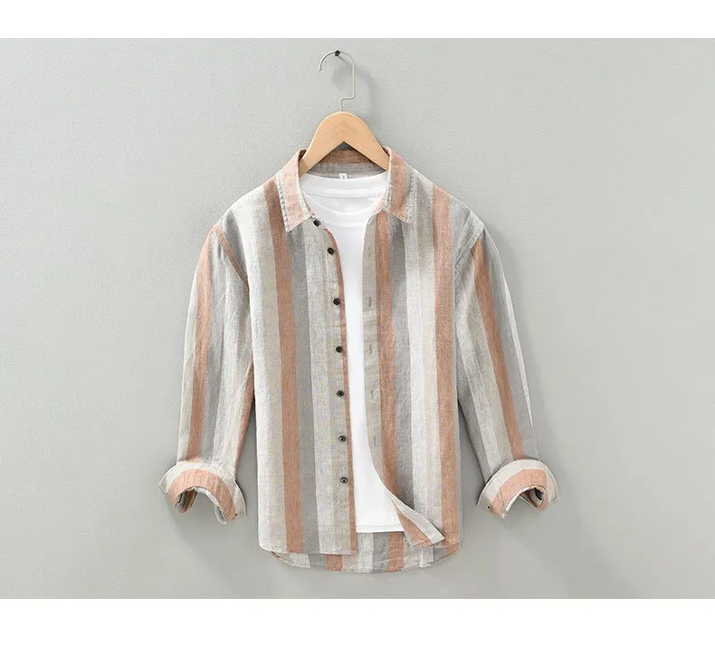 Striped Color Matching Long Linen Sleeves Shirt