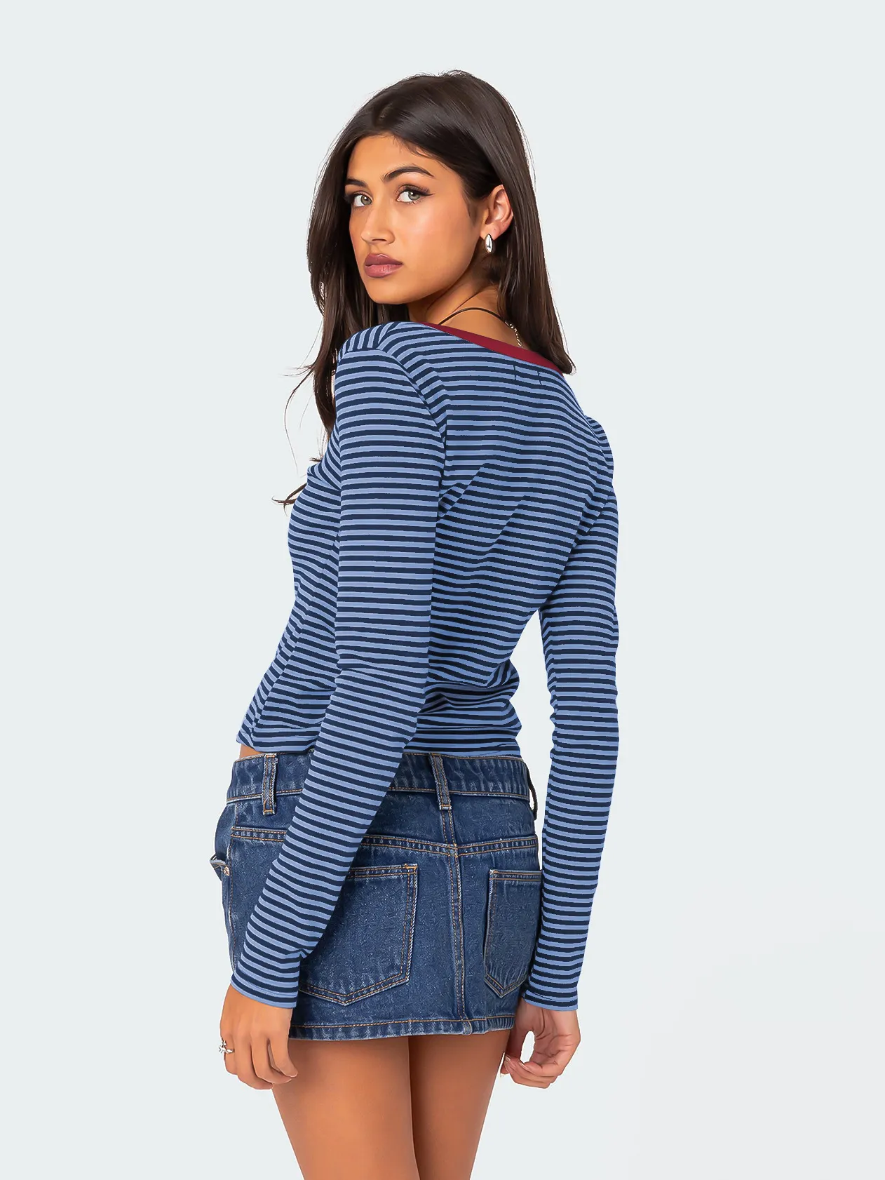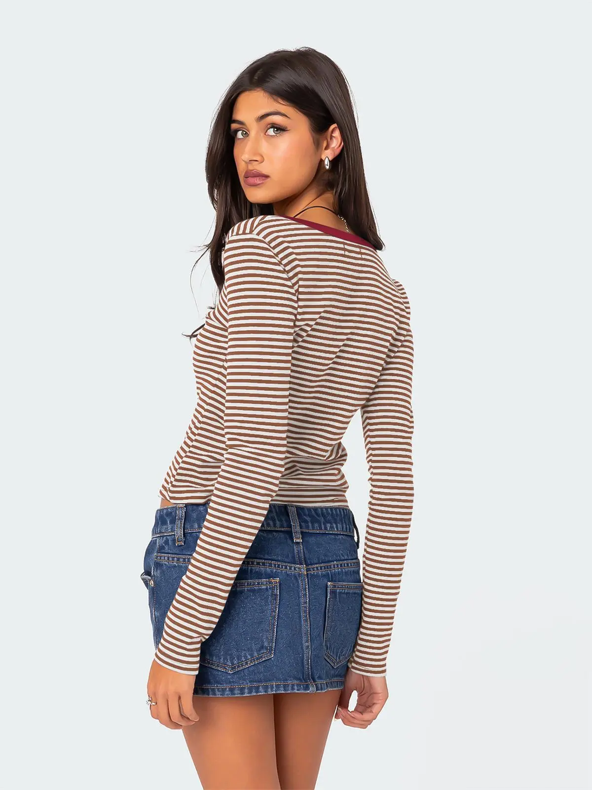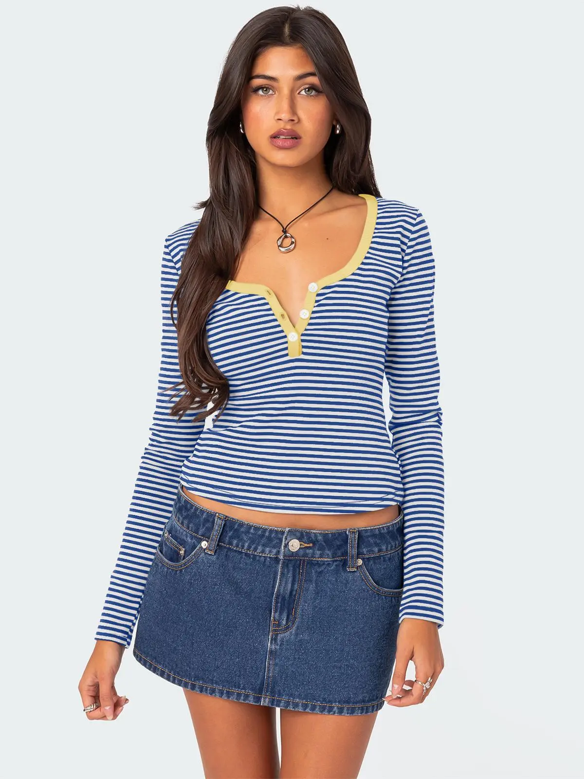 Pair this top with high-waisted jeans or skirts for a casual daytime look. Add a blazer or cardigan for a more polished appearance suitable for work or evening outings.