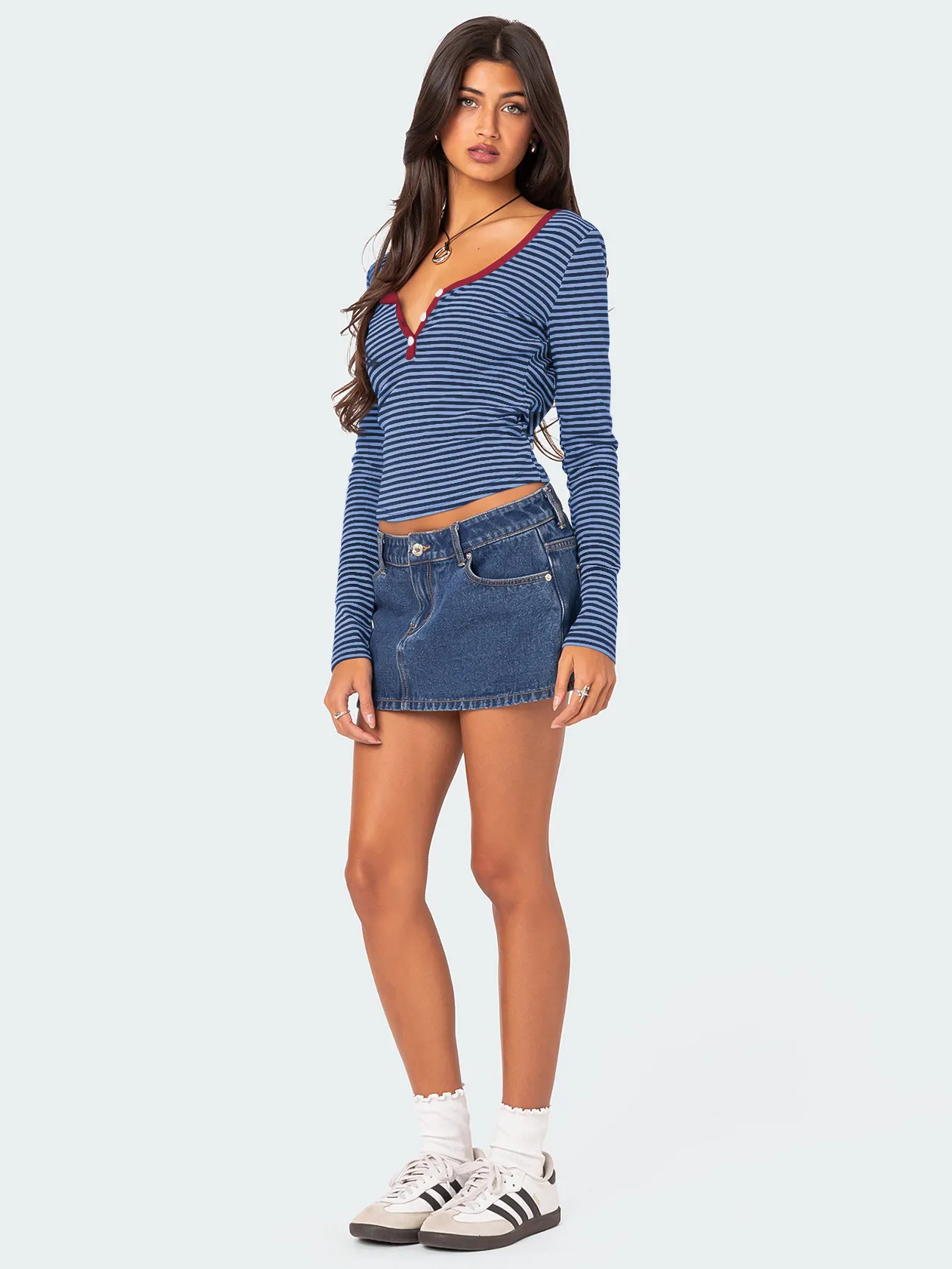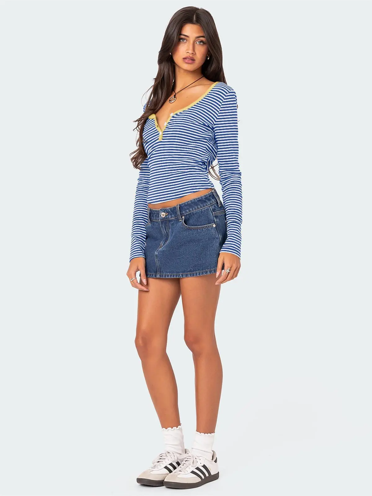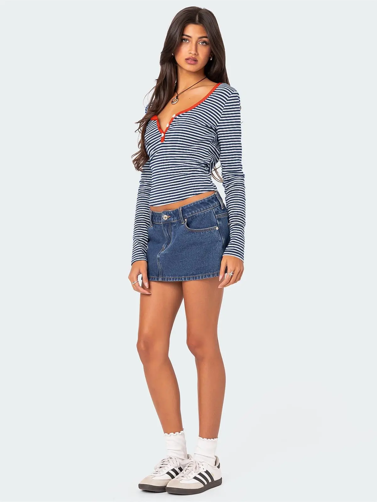 Pair this top with high-waisted jeans or skirts for a casual daytime look. Add a blazer or cardigan for a more polished appearance suitable for work or evening outings.