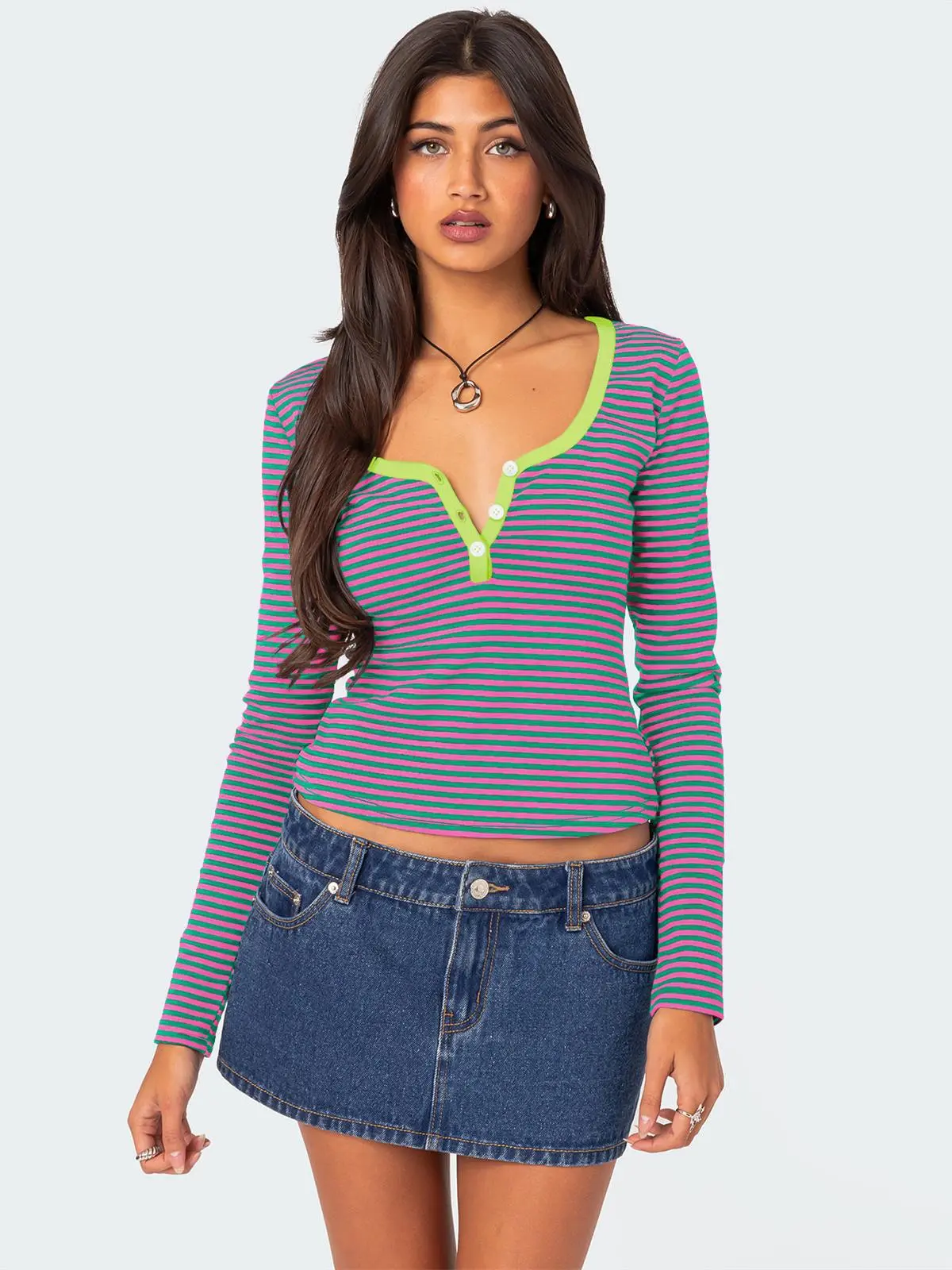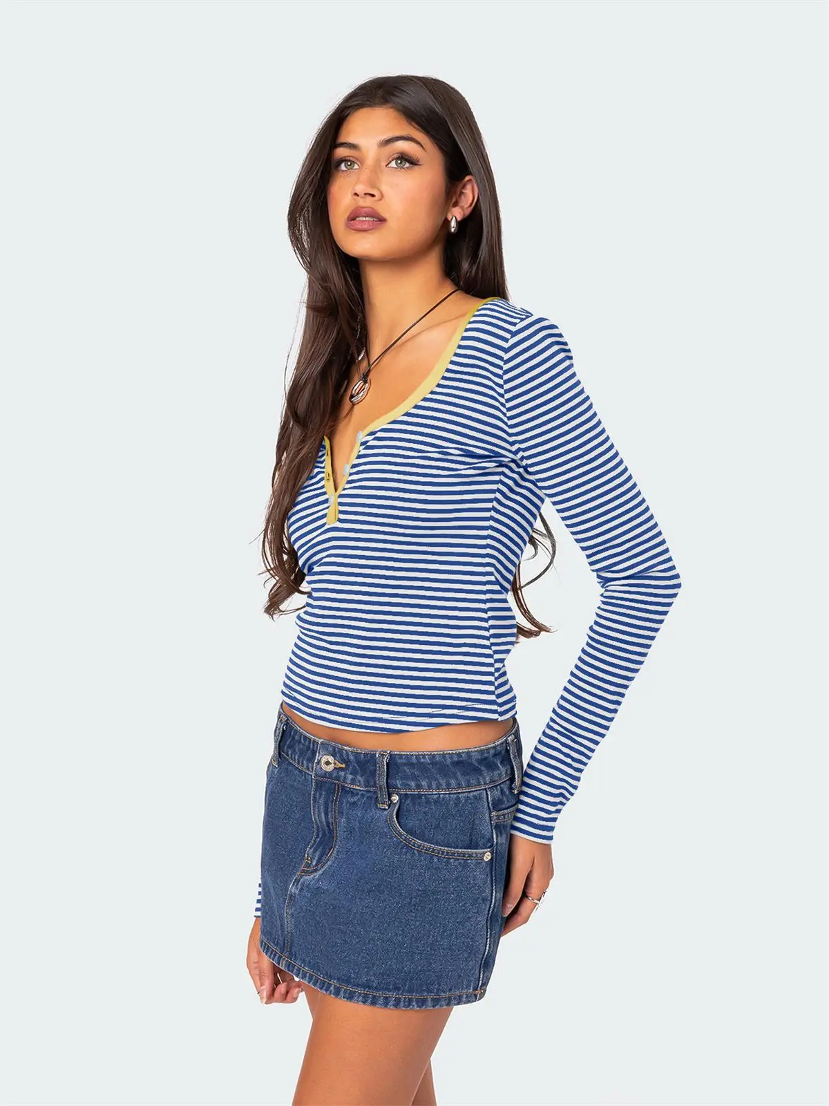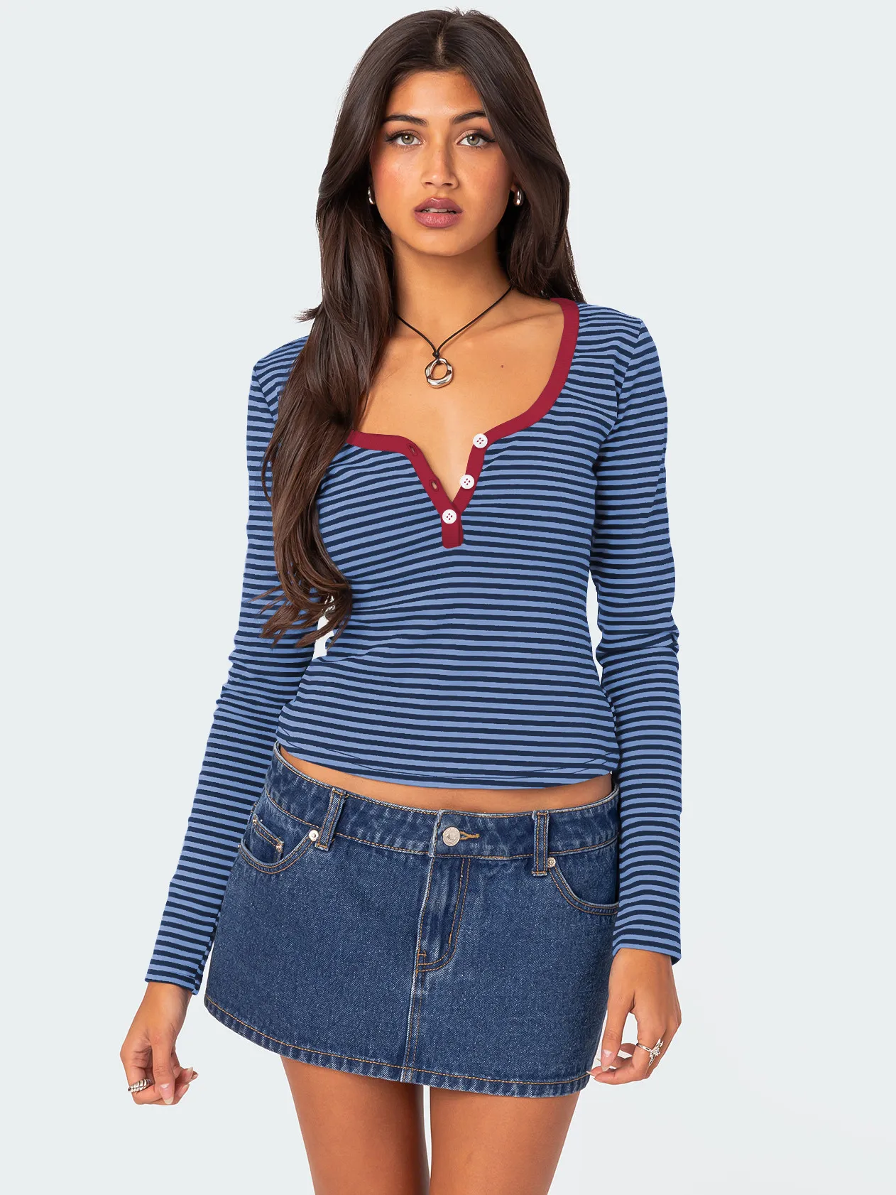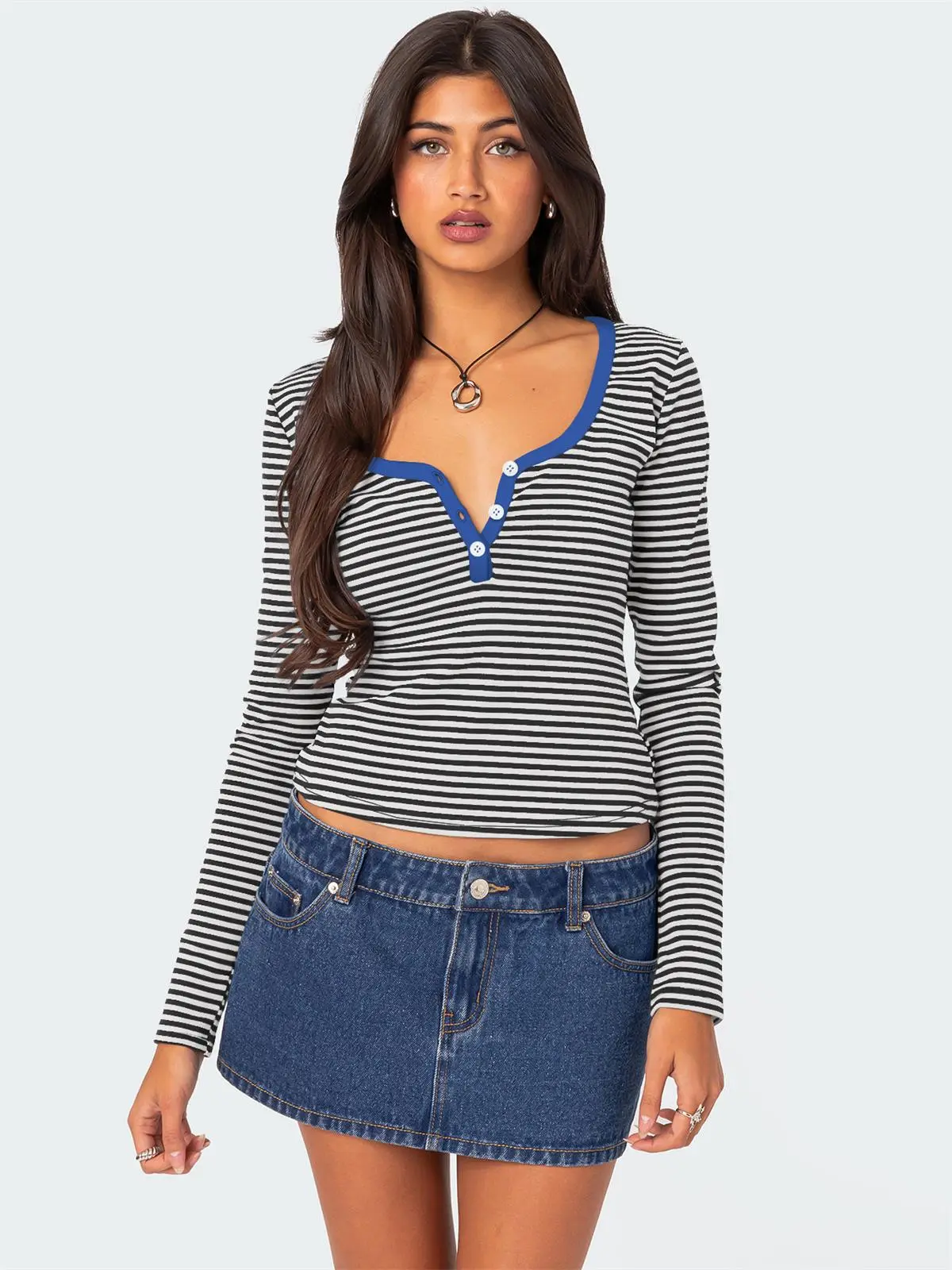 Contrast Color Striped Sweater Women’s Button Slim T-shirt