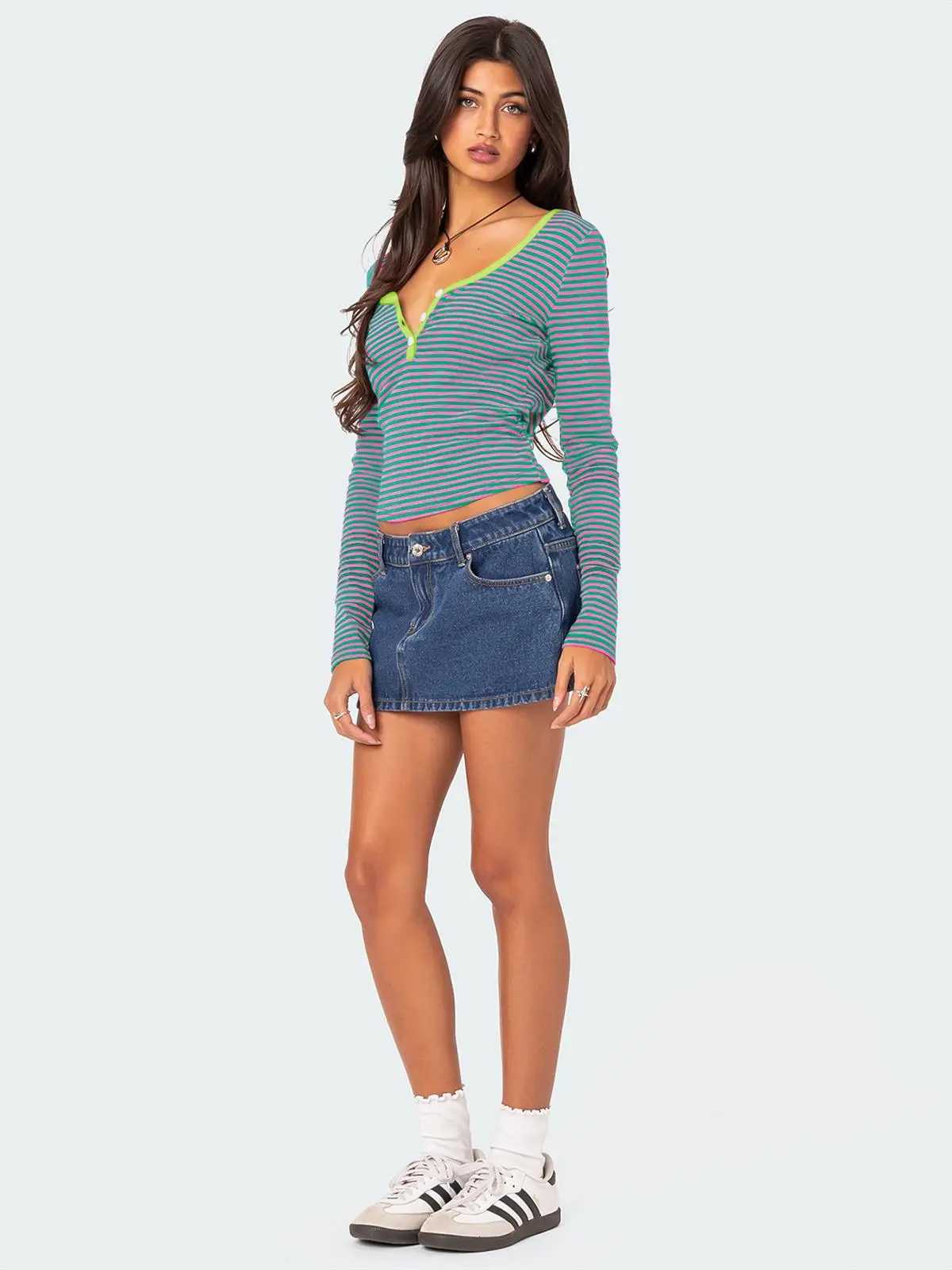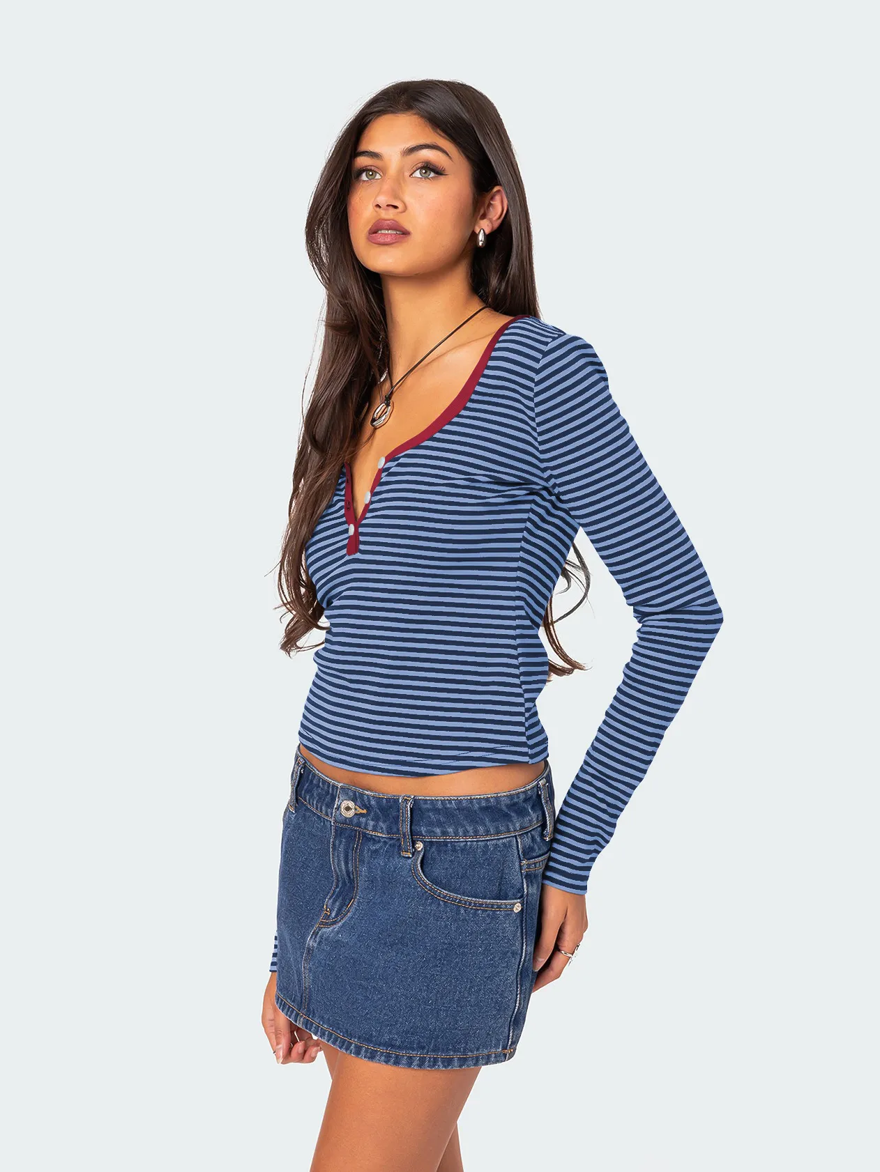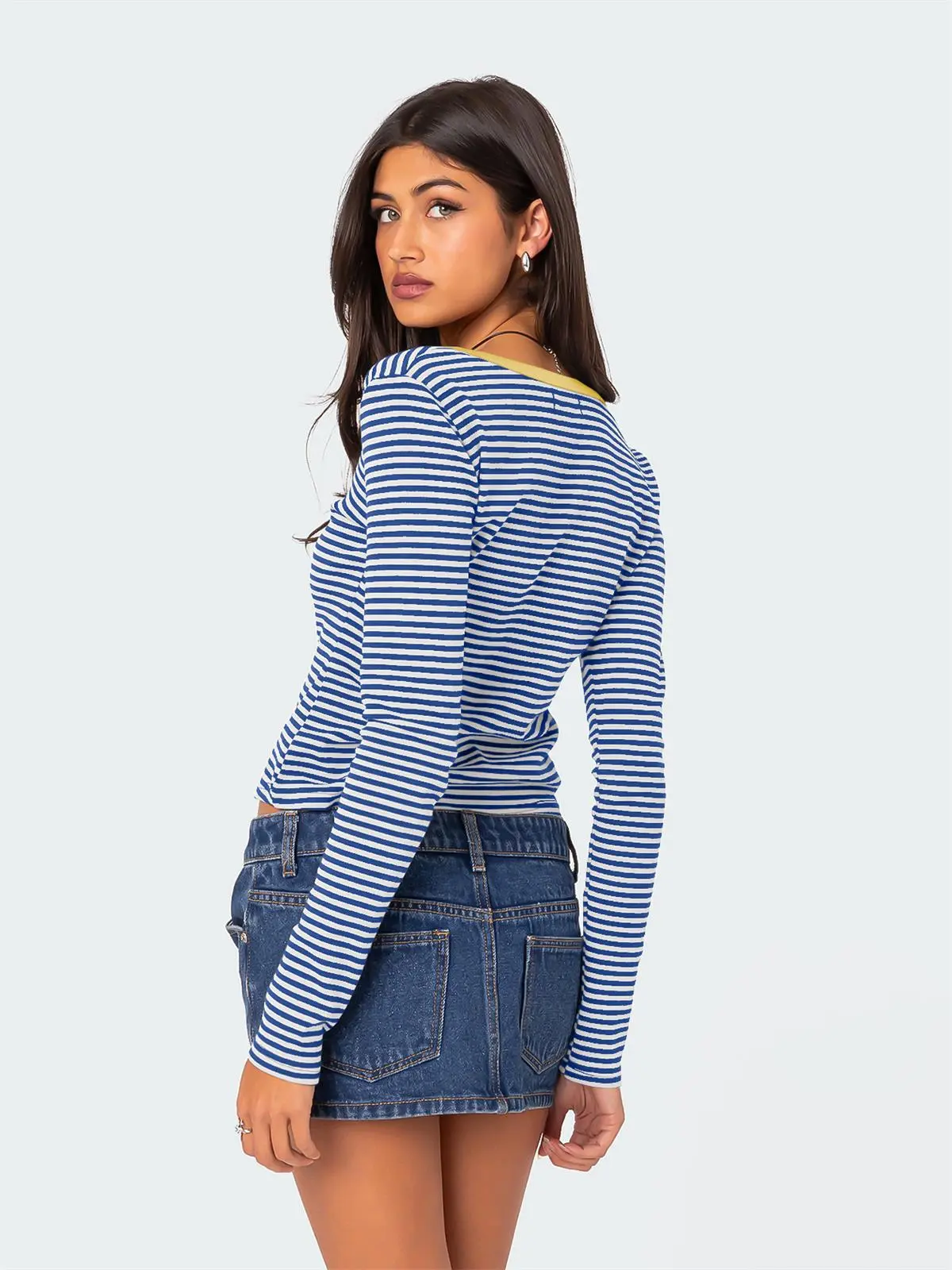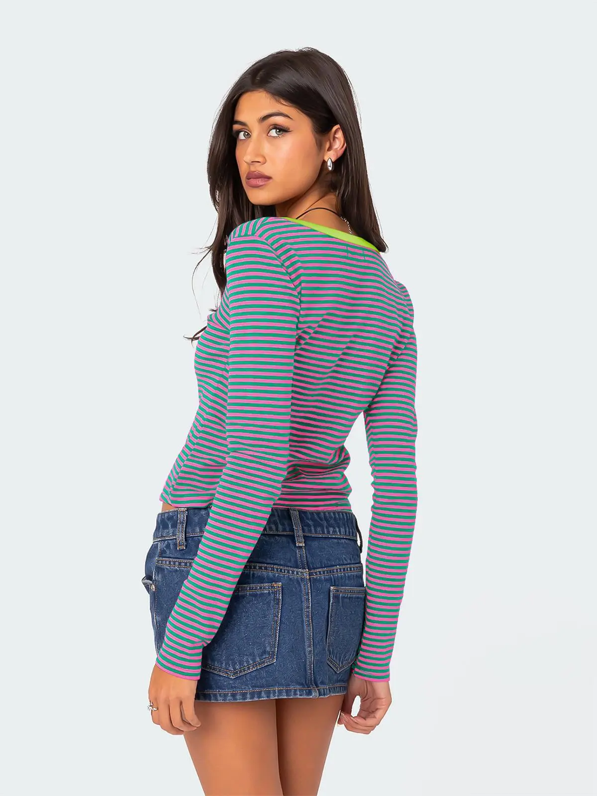 Contrast Color Striped Sweater Women’s Button Slim T-shirt