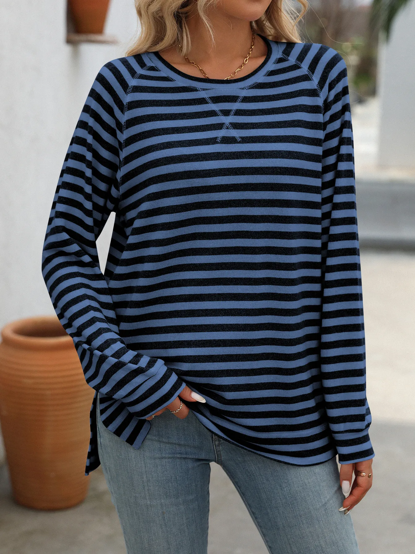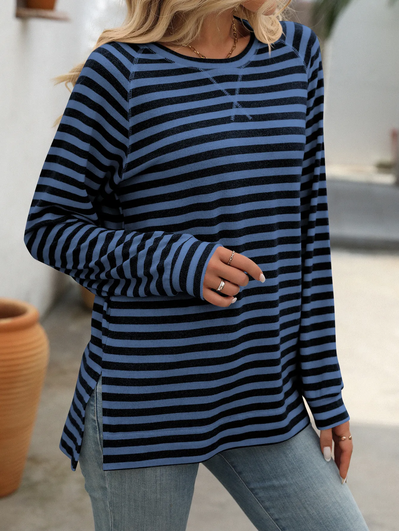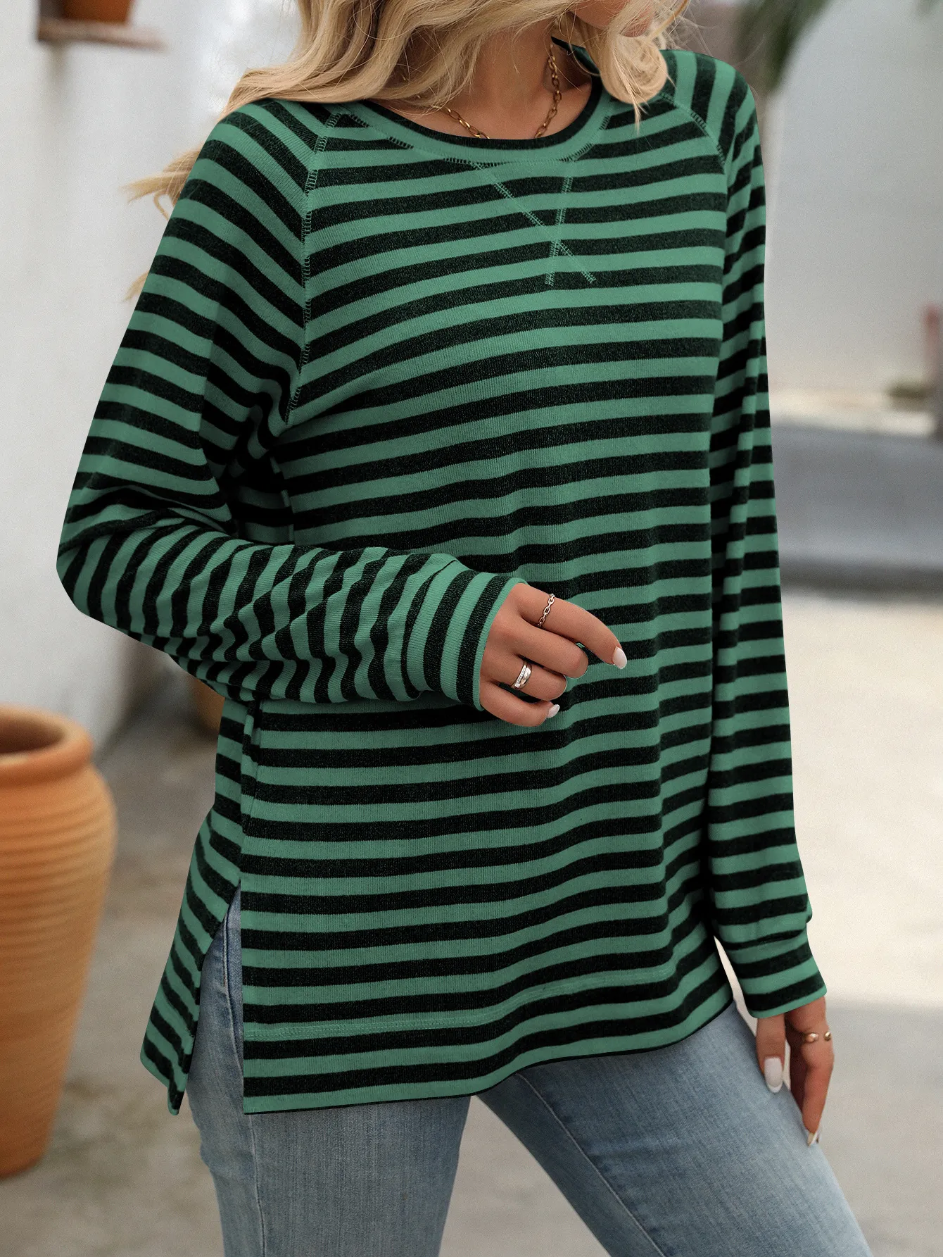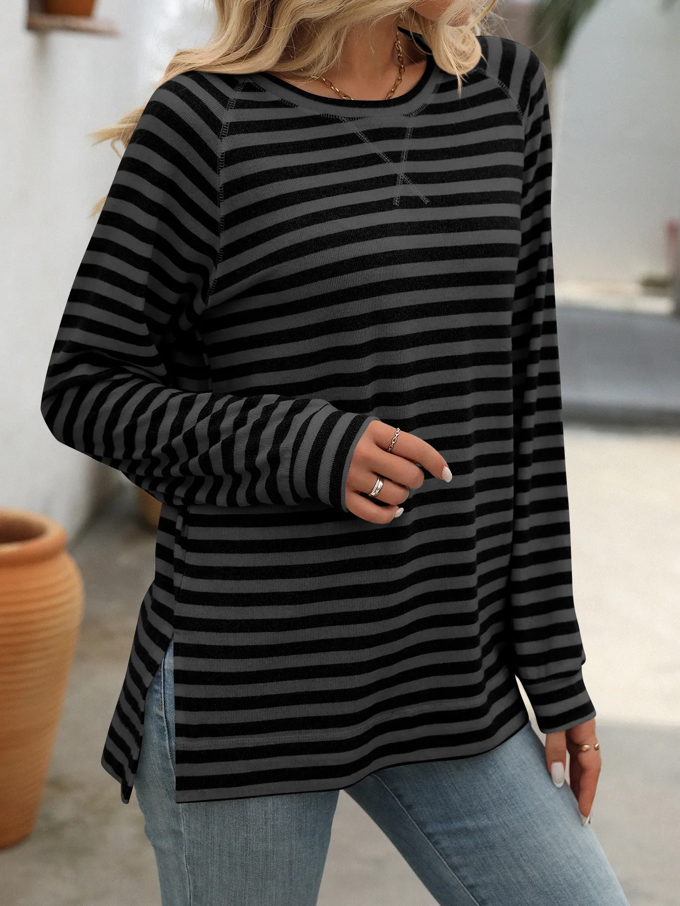 Style Tips Pair this Striped Contrast Color Round Neck Long Sleeve Loose-fitting T-shirt Top with your favorite jeans and sneakers for a laid-back look, or tuck it into a high-waisted skirt and add some statement jewelry for a more dressed-up vibe. The versatile design allows you to experiment with different styles effortlessly.