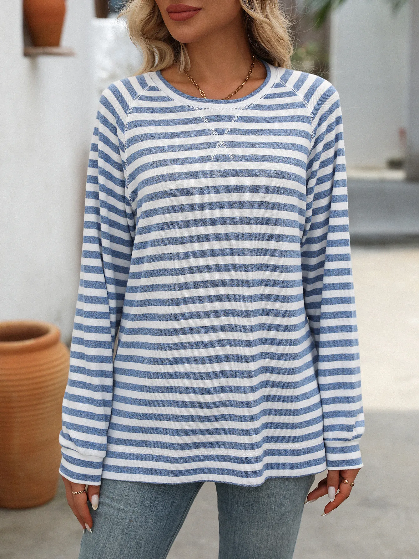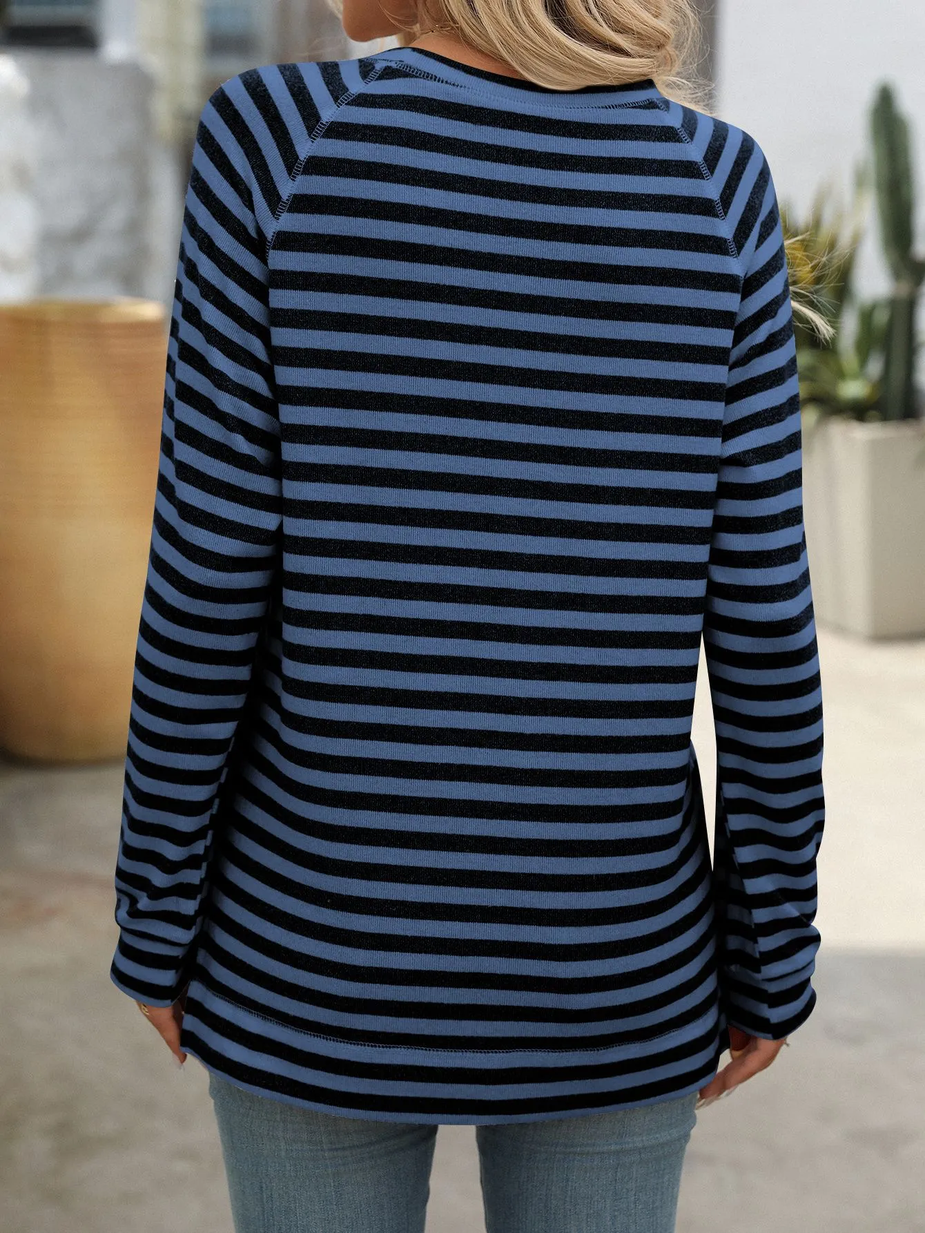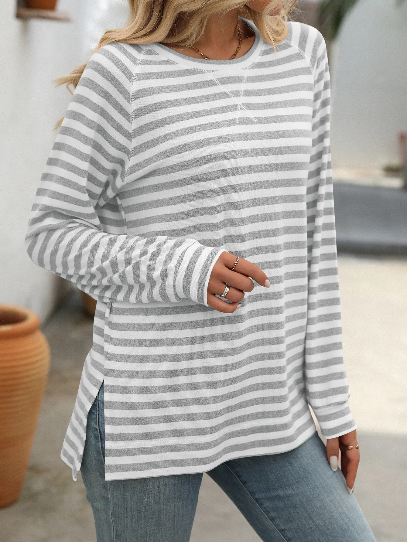 Style Tips Pair this Striped Contrast Color Round Neck Long Sleeve Loose-fitting T-shirt Top with your favorite jeans and sneakers for a laid-back look, or tuck it into a high-waisted skirt and add some statement jewelry for a more dressed-up vibe. The versatile design allows you to experiment with different styles effortlessly.