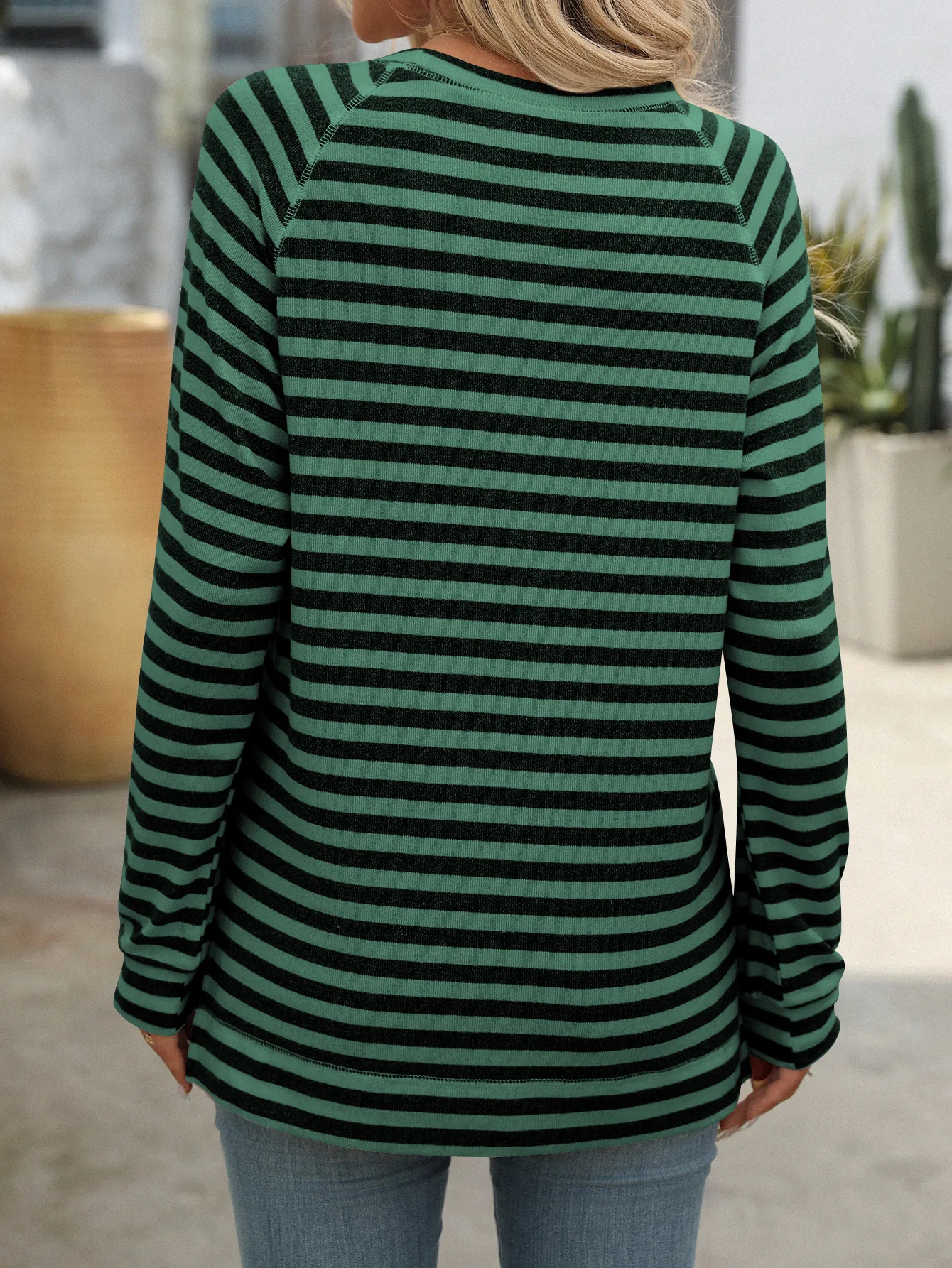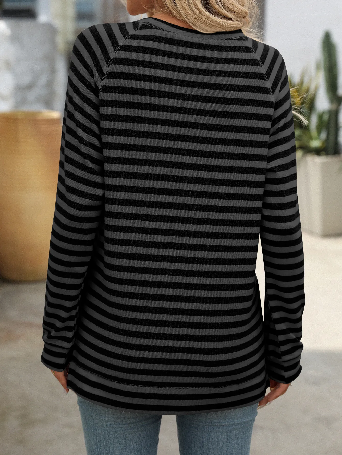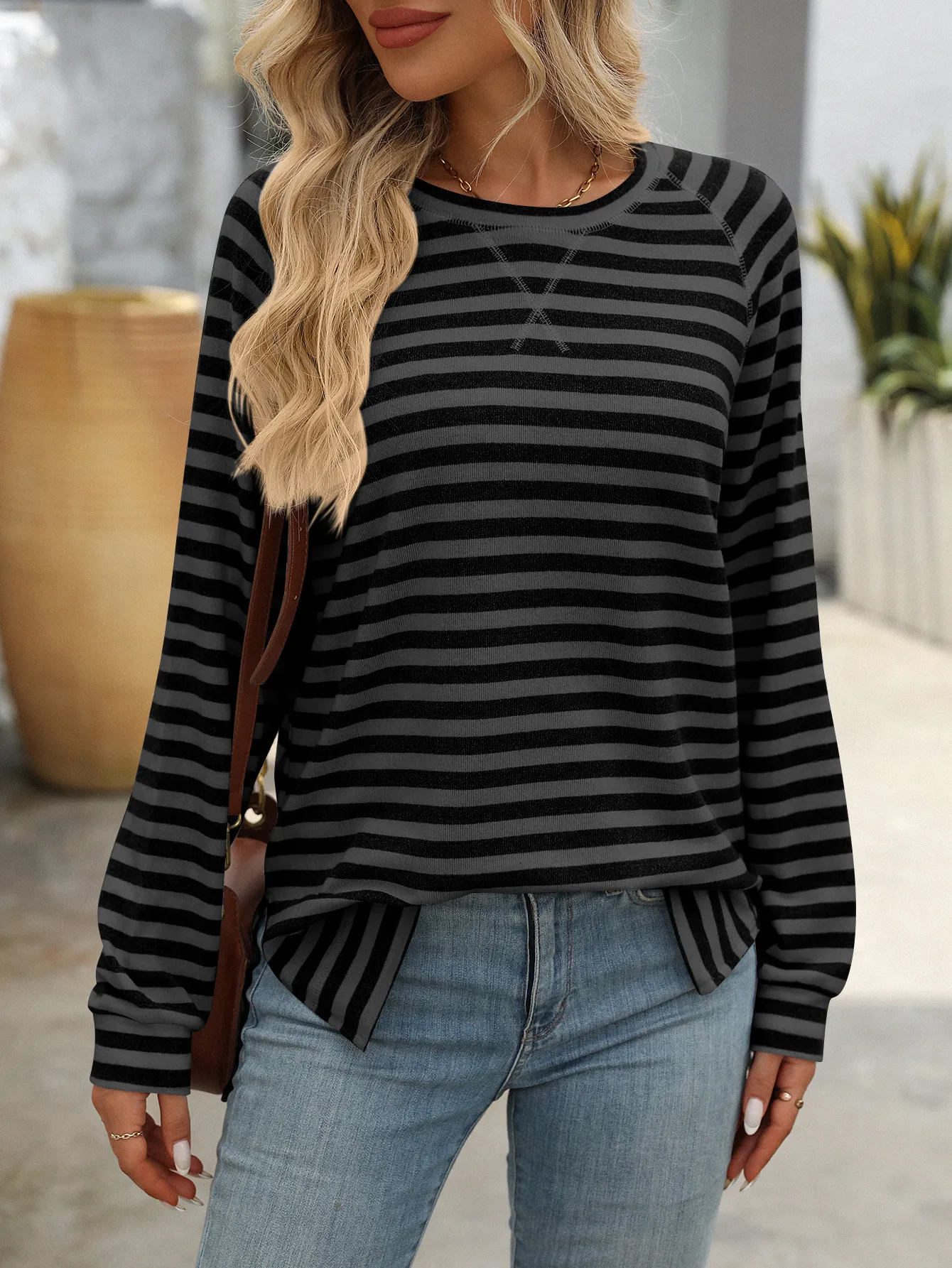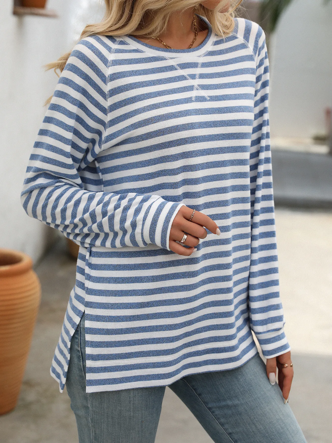 Style Tips Pair this Striped Contrast Color Round Neck Long Sleeve Loose-fitting T-shirt Top with your favorite jeans and sneakers for a laid-back look, or tuck it into a high-waisted skirt and add some statement jewelry for a more dressed-up vibe. The versatile design allows you to experiment with different styles effortlessly.