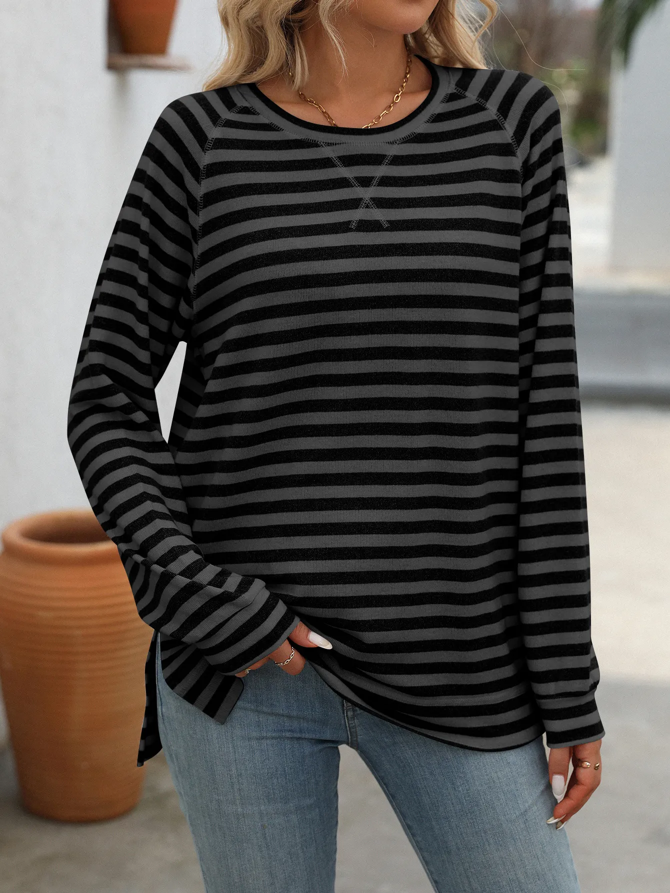The Striped Contrast Color Round Neck Long Sleeve Loose-fitting T-shirt Top is the perfect blend of comfort, style, and versatility. Whether you're dressing for a casual day out or just lounging at home, this t-shirt will keep you looking effortlessly stylish while ensuring maximum comfort. Add it to your collection and enjoy a piece that you can rely on for any casual occasion.