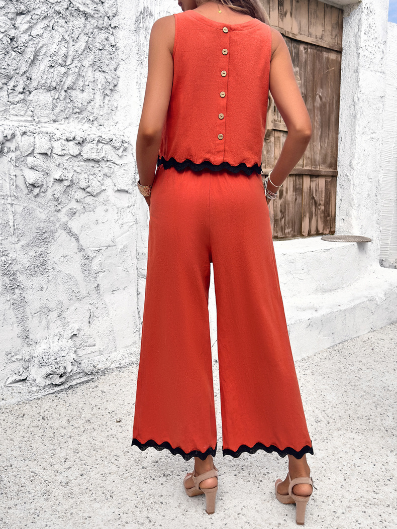 Summer Wave Print Sleeveless Top and Trousers Set