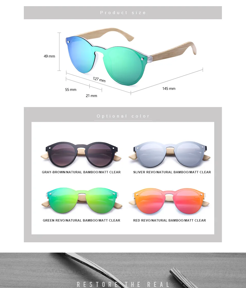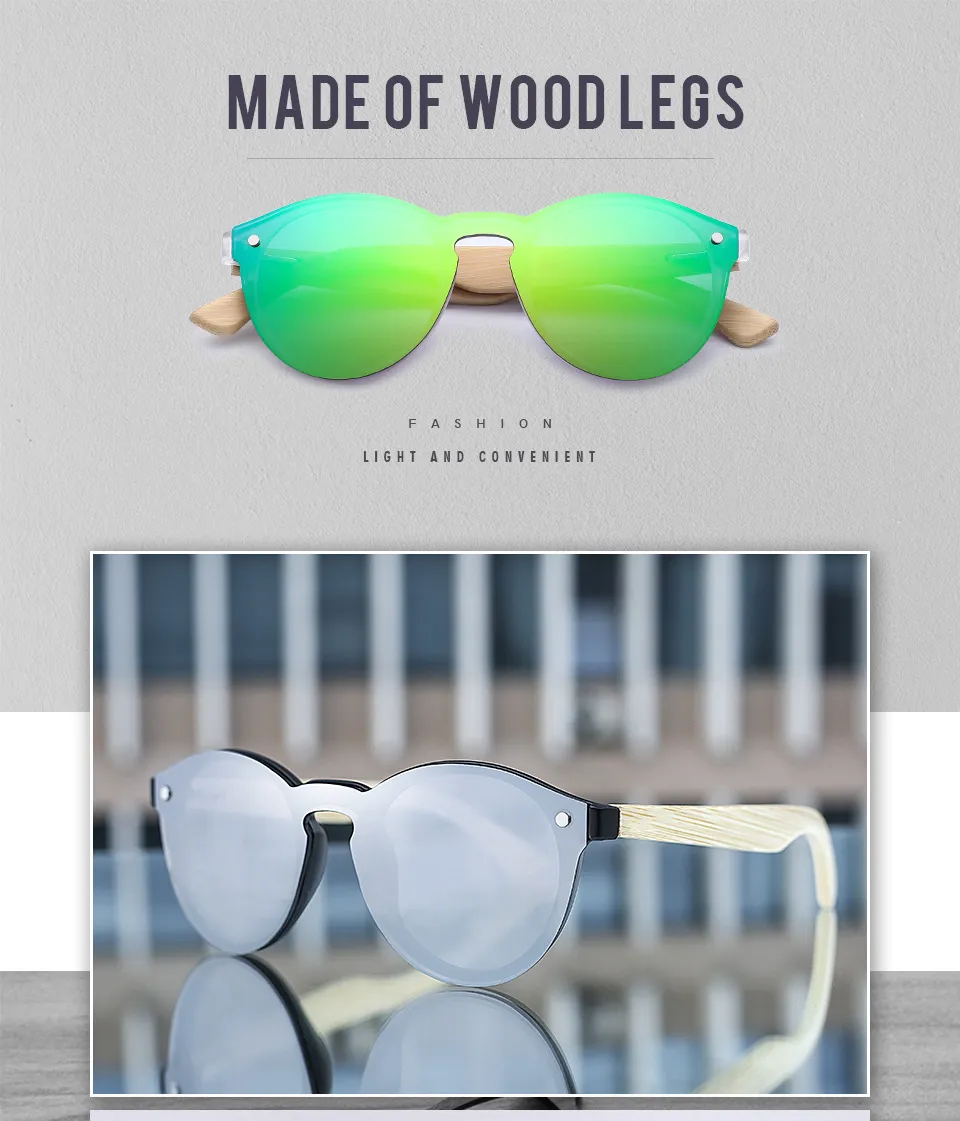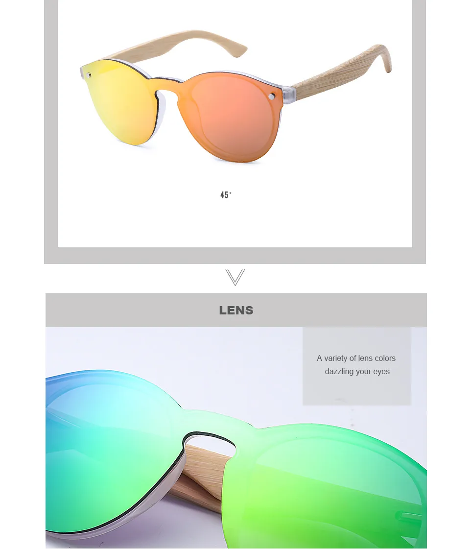 These sunglasses showcase lightweight bamboo frames that are sustainable, durable, and comfortable for long wear. The round lenses are enhanced with a color film coating, adding vibrant hues and reflective qualities that give a unique aesthetic while providing effective sun protection.