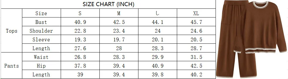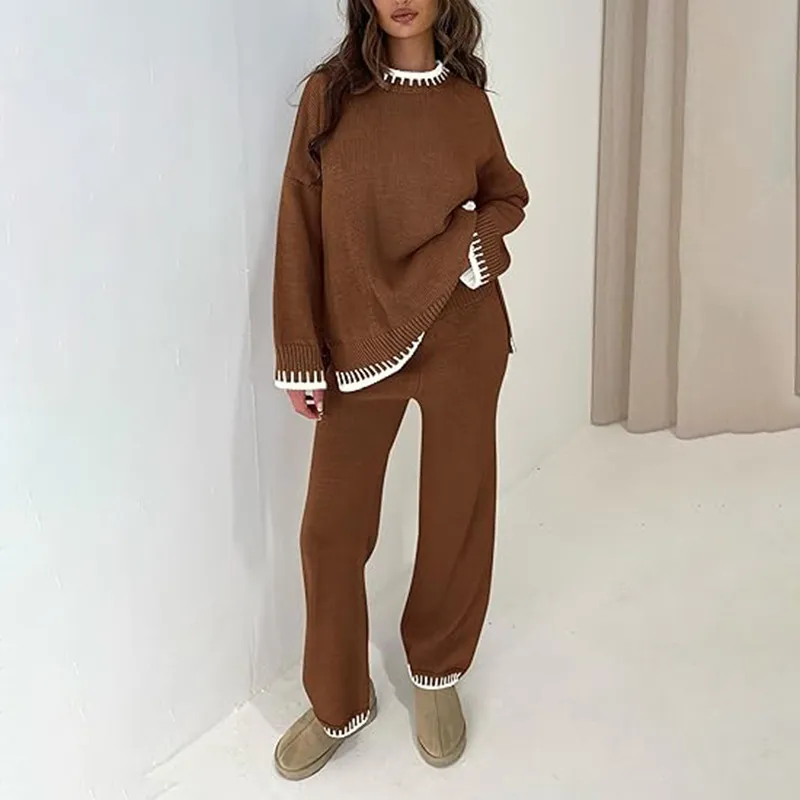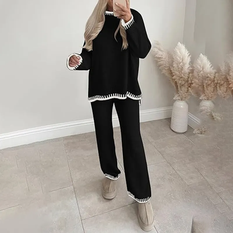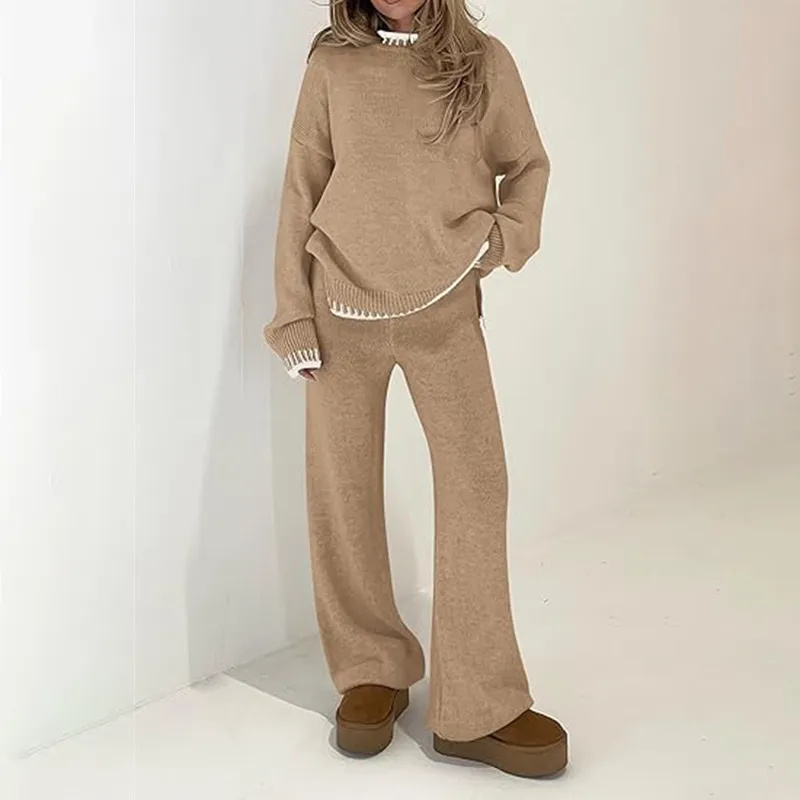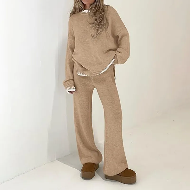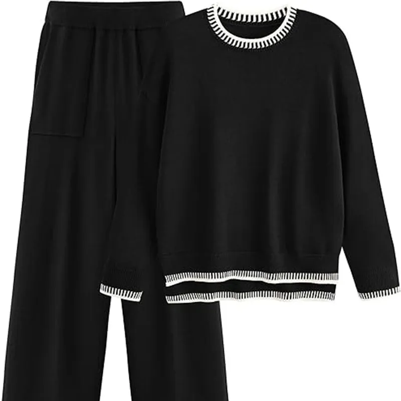 Sweater Knit Casual Long Sleeve Pullover Wide Leg Pants Suit
