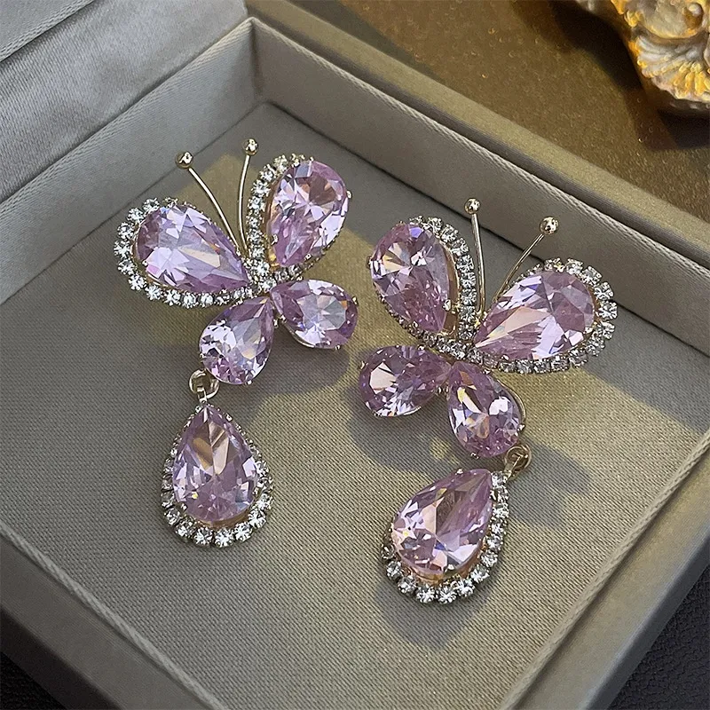 Sweet Light Luxury Rhinestone Zircon Butterfly Water Drop Silver Pin Earrings