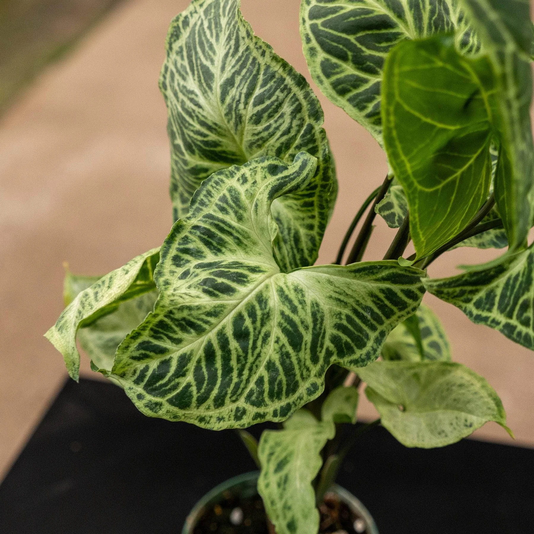 Syngonium podophyllum 'Batik' features arrowhead-shaped leaves with an elaborate pattern of white or cream-colored veins that contrast beautifully against the deep green background of the leaves. The variegation creates a batik-like effect, giving the plant its name. The leaves are slightly glossy and have a smooth texture, adding to the plant's overall appeal. As the plant matures, the leaves can grow larger and more divided, enhancing its exotic look.