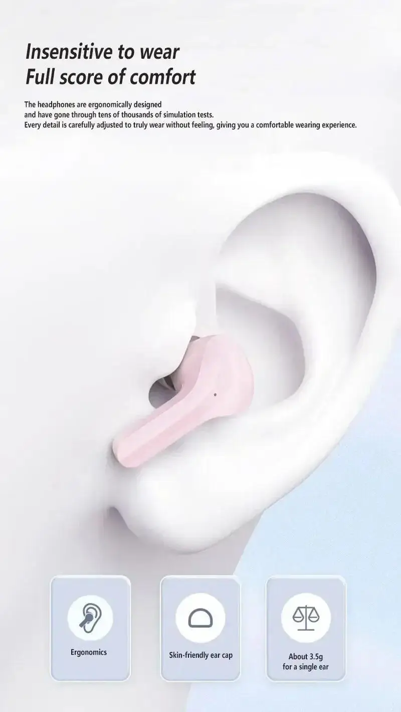 power status of the wireless earphones and the charging case at any time. This series of Bluetooth headsets uses a futuristic translucent