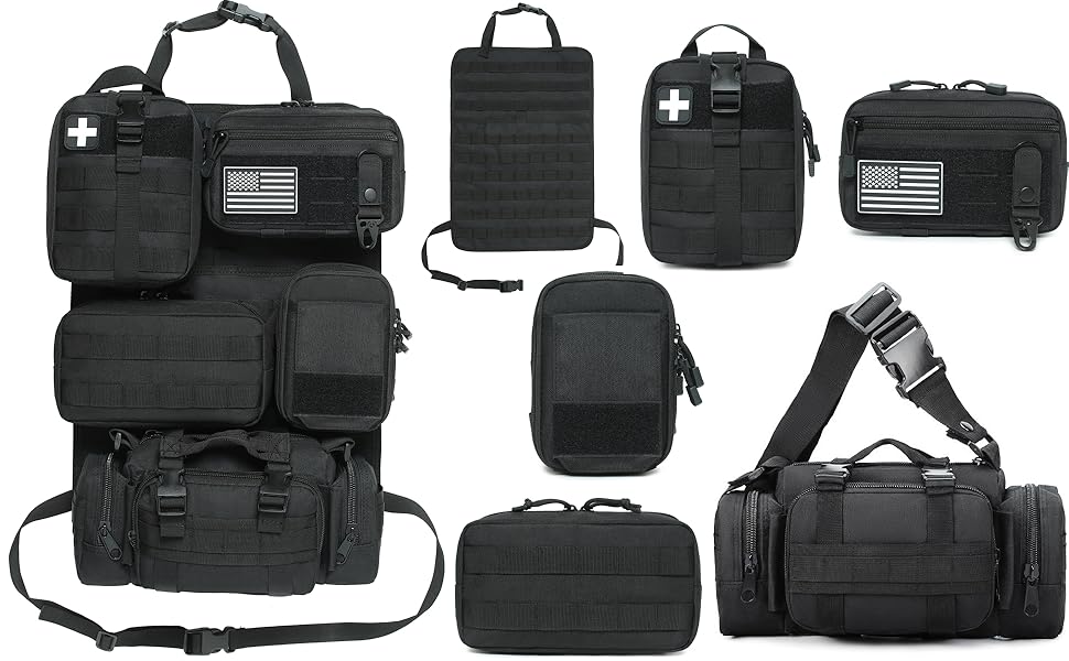 - 【Package Including】The molle seat back organizer includes: 1*Tactical Molle Bag,1*Cell phone Pouch,1*Medical Pouch,1*Large Item Storage Pouch,1*Multipurpose Waist Pack,it provides ample storage space for all your essentials and perfect for your outdoor activities.