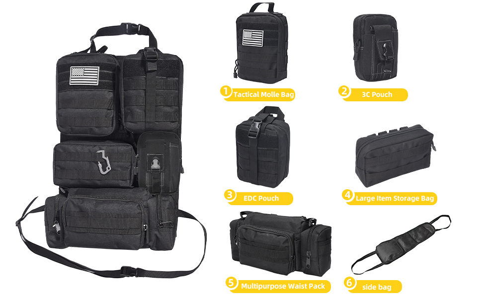 - Military Molle System - Lots Of Storage:Tactical Molle Seat Back Organizer with 5 different types of bags has a standard MOLLE strap design,which can be used alone or in combination, provides ample storage space, keeping your car clean and organized