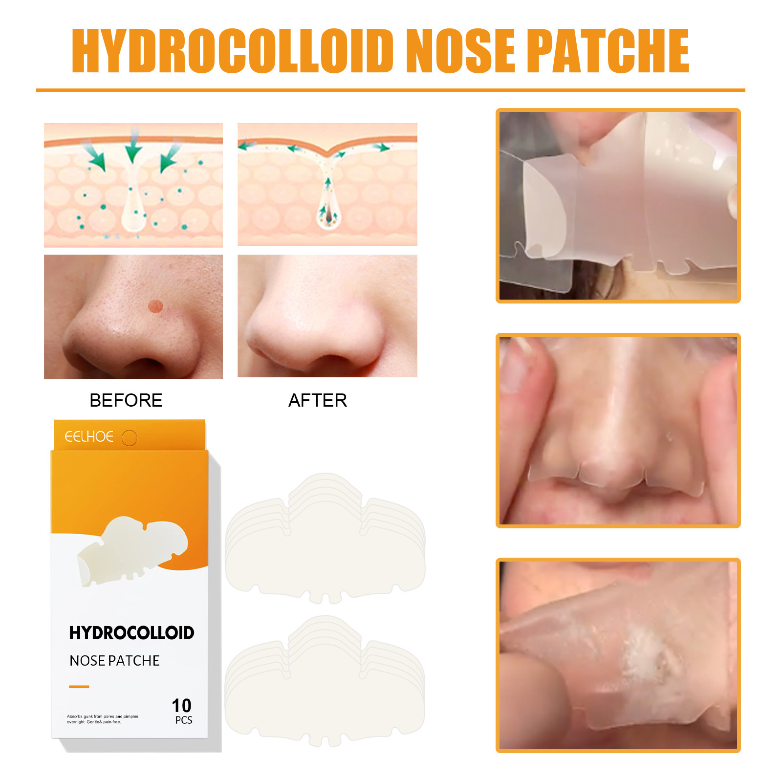 The blackhead removing strip works by deeply penetrating the pores to lift and remove blackheads, excess oil, and impurities. Its powerful adhesion ensures that even stubborn blackheads are effectively extracted, leaving your pores clean and minimized.