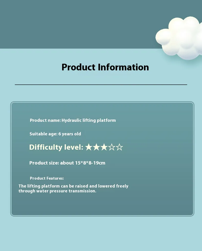 This kit serves as both an educational tool and an enjoyable project for DIY enthusiasts. With easy-to-follow instructions, users can assemble their own hydraulic elevator system and learn about the key principles of hydraulics, mechanical design, and fluid dynamics. It's a fun and interactive way to explore how hydraulic systems work and how they are applied in the real world.