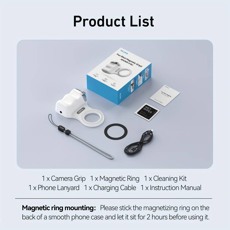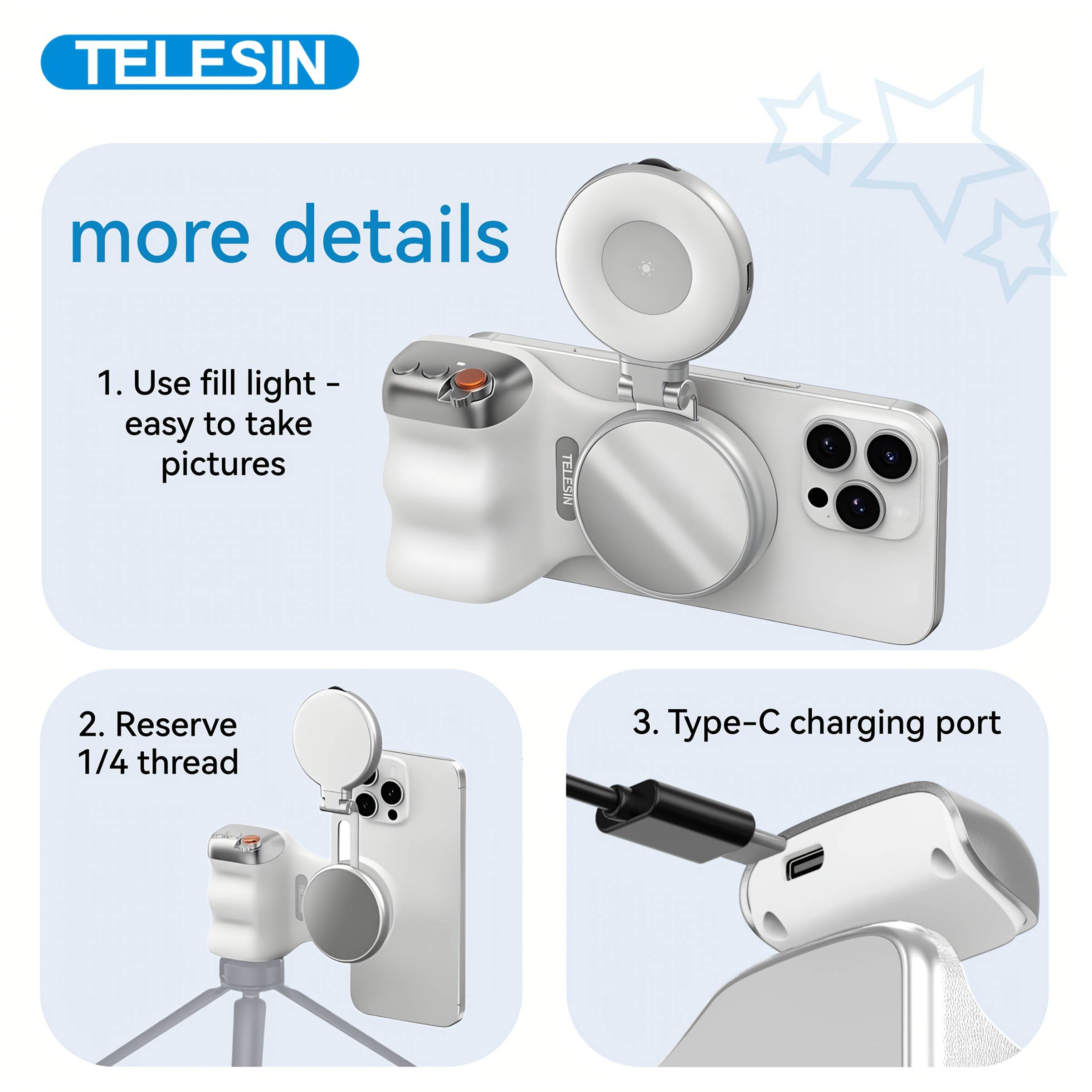 The TELESIN Magnetic Shutter Handle for iPhone and Android brings professional-grade photography to your smartphone with a DSLR-style handle, removable wireless shutter button, and ergonomic grip. Designed to enhance your smartphone photography experience, this magnetic shutter handle allows you to capture stunning photos and videos with ease, whether you’re shooting on your phone or using a smartphone tripod or selfie stick.