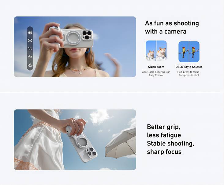 The ergonomic grip ensures comfort during extended shooting sessions, helping you maintain better control of your camera or phone without