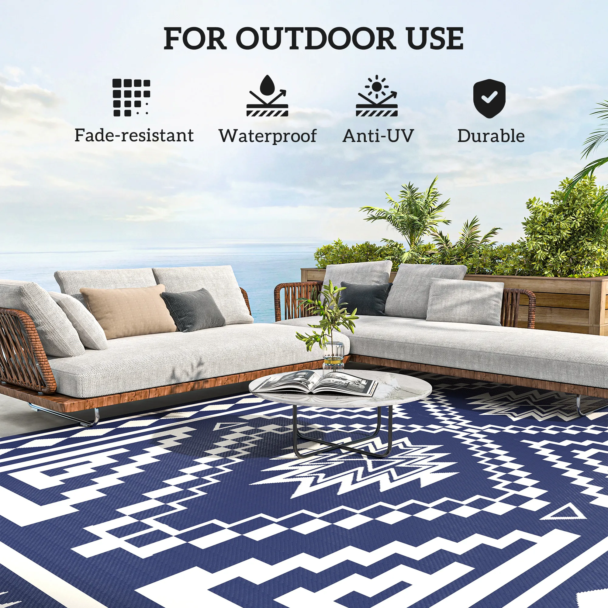 Description:Camp on a carpet with Outsunny. This porch rug is designed to handle dirt. Outdoor-ready, our rug really cleans up fast; sweep, spray, wipe, or wave it; its powerful polypropylene fibers stay dry and don't saturate. Keep an outdoor rug in the camper, RV, or car; it's excellent for camping, beach trips, patio picnics, or anywhere outside. The color is reversible, meaning you can flip our plastic rug over for a fresh side or style. Upholster the outdoors with Outsunny. Features: - Reversible with double sides for varied use - Made of polypropylene, with a protective coating to help prevent fading and sun damage - Features robust edging to prevent fraying - Space-saving foldable design for easy storage and transport - Carry bag included - Versatile for camping, picnics, RV road tours, and more Specification: - Color: Blue and White - Style: Square Patchwork - Materials: 310g/m² Polypropylene, Non-Woven Fabric - Dimensions: 215.7" L x 107.9" W - Carry Bag Dimensions: 36.6" L x 13.4" W x 7.5" H - Item Label: 84J-063V00BU - Note: Not fireproof, keep away from fire Package Includes: - 1 x Outdoor Rug - 1 x Carry Bag Camp on a carpet with Outsunny. Features: - Reversible with double sides for varied use - Made of polypropylene, with a protective coating to help prevent fading and sun damage - Features robust edging to prevent fraying - Space-saving foldable design for easy storage and transport - Carry bag included - Versatile for camping, picnics, RV road tours, and more Specification: - Color: Black and Gray - Style: Square Patchwork - Materials: 310g/m² Polypropylene, Non-Woven Fabric - Dimensions: 215.7" L x 107.9" W - Carry Bag Dimensions: 36.6" L x 13.4" W x 7.5" H - Item Label: 84J-063V00GY - Note: Not fireproof, keep away from fire Package Includes: - 1 x Outdoor Rug - 1 x Carry Bag Camp on a carpet with Outsunny. Features: - Reversible with double sides for varied use - Made of polypropylene, with a protective coating to help prevent fading and sun damage - Features robust edging to prevent fraying - Space-saving foldable design for easy storage and transport - Carry bag included - Versatile for camping, picnics, RV road tours, and more Specification: - Color: Black and White - Style: Square Patchwork - Materials: 310g/m² Polypropylene, Non-Woven Fabric - Dimensions: 215.7" L x 107.9" W - Carry Bag Dimensions: 36.6" L x 13.4" W x 7.5" H - Item Label: 84J-063V00WT - Note: Not fireproof, keep away from fire Package Includes: - 1 x Outdoor Rug - 1 x Carry Bag.