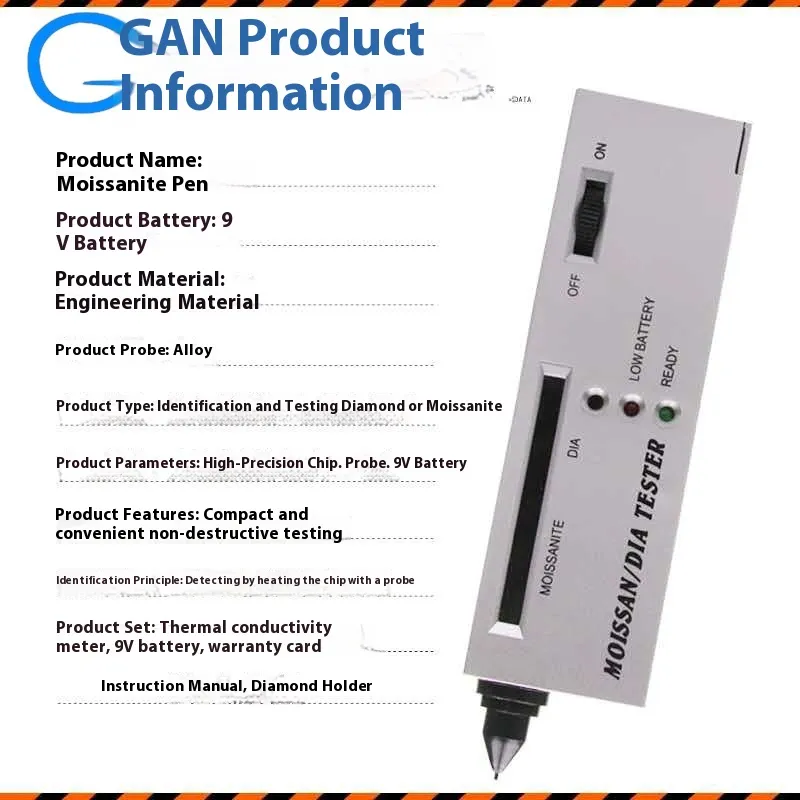 distinguish between diamonds, moissanite and other simulants. The unit presents a probe (often ~0.6 mm tip) that you touch to the stone’s