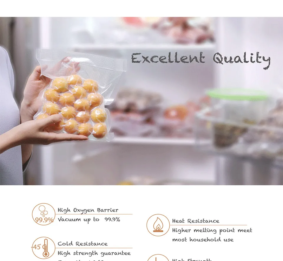 The bag’s strong construction ensures that it can handle a variety of food types, from sharp-edged items to heavy meats, without breaking or leaking. Whether you’re storing food for short-term use or long-term storage, these vacuum bags offer peace of mind that your food will stay safe and fresh.