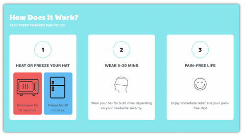 The Thermaxâ„¢ relief hat uses compression and cold therapy that provides natural and fast relief for all types of headaches. From migraines to mild headaches, you'll instantly feel the difference.