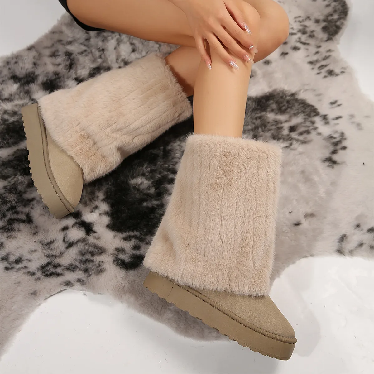 winter outfit. The boots are perfect for pairing with jeans, leggings, or skirts.5. Furry Cotton Exterior: