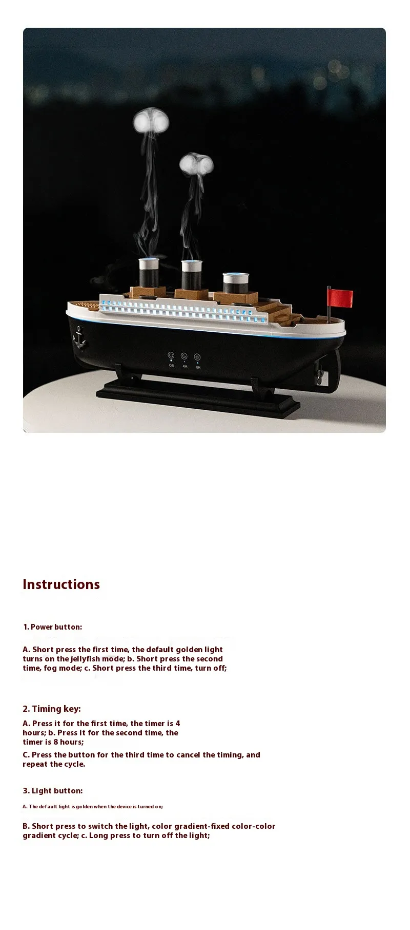By combining themed design with practical humidification technology, the Titanic Ship Ultrasonic Humidifier delivers both air comfort and decorative appeal for everyday indoor environments.