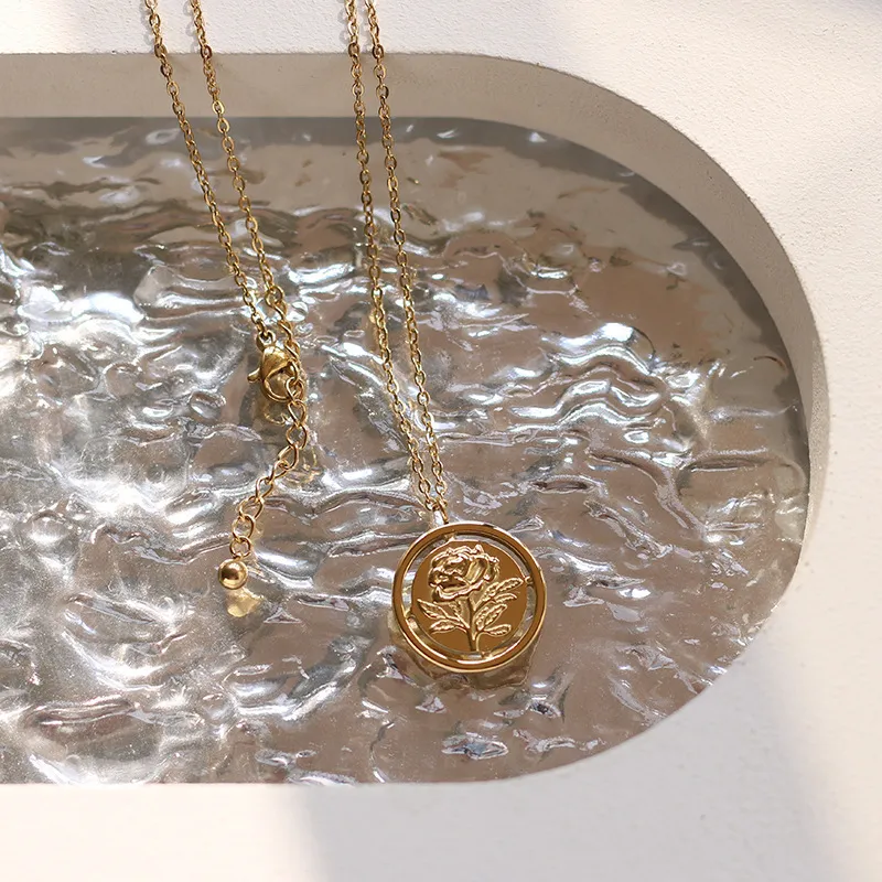 Titanium Steel French Retro Three-dimensional Flower Cutout Rose Necklace Electroplated 18K Gold